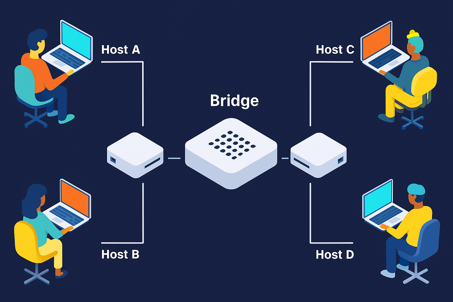 Bridge (cầu nối mạng) là một thiết bị quan trọng trong hạ tầng mạng, giúp kết nối các mạng LAN riêng lẻ thành một hệ thống thống nhất, tối ưu lưu lượng và giảm xung đột dữ liệu. Hoạt động ở tầng liên kết dữ liệu (Layer 2), Bridge sử dụng địa chỉ MAC để lọc và chuyển tiếp khung dữ liệu đến đúng phân đoạn mạng, đảm bảo dữ liệu di chuyển hiệu quả.