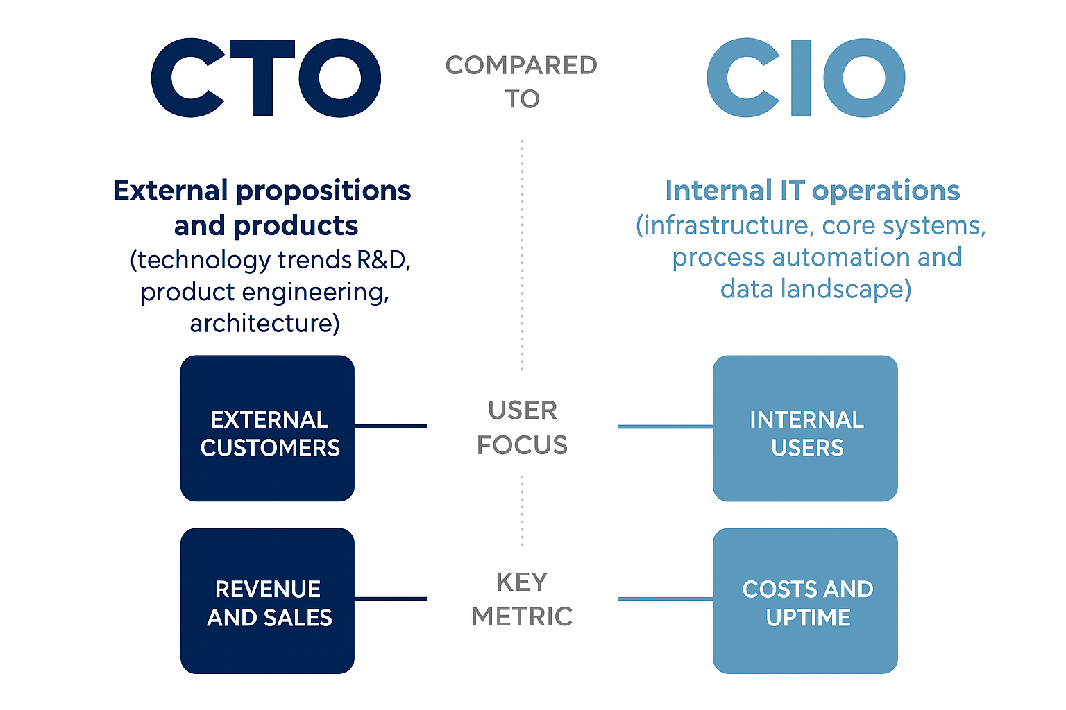 Nhiều người thường nhầm lẫn rằng CTO và CIO có thể thay thế cho nhau, nhưng thực tế hai vị trí này bổ sung và hỗ trợ lẫn nhau. CTO định hình cách công nghệ được áp dụng ra bên ngoài – vào sản phẩm, dịch vụ và trải nghiệm khách hàng, trong khi CIO bảo đảm hệ thống nội bộ hoạt động ổn định, tạo nền tảng vững chắc để CTO triển khai ý tưởng đổi mới.