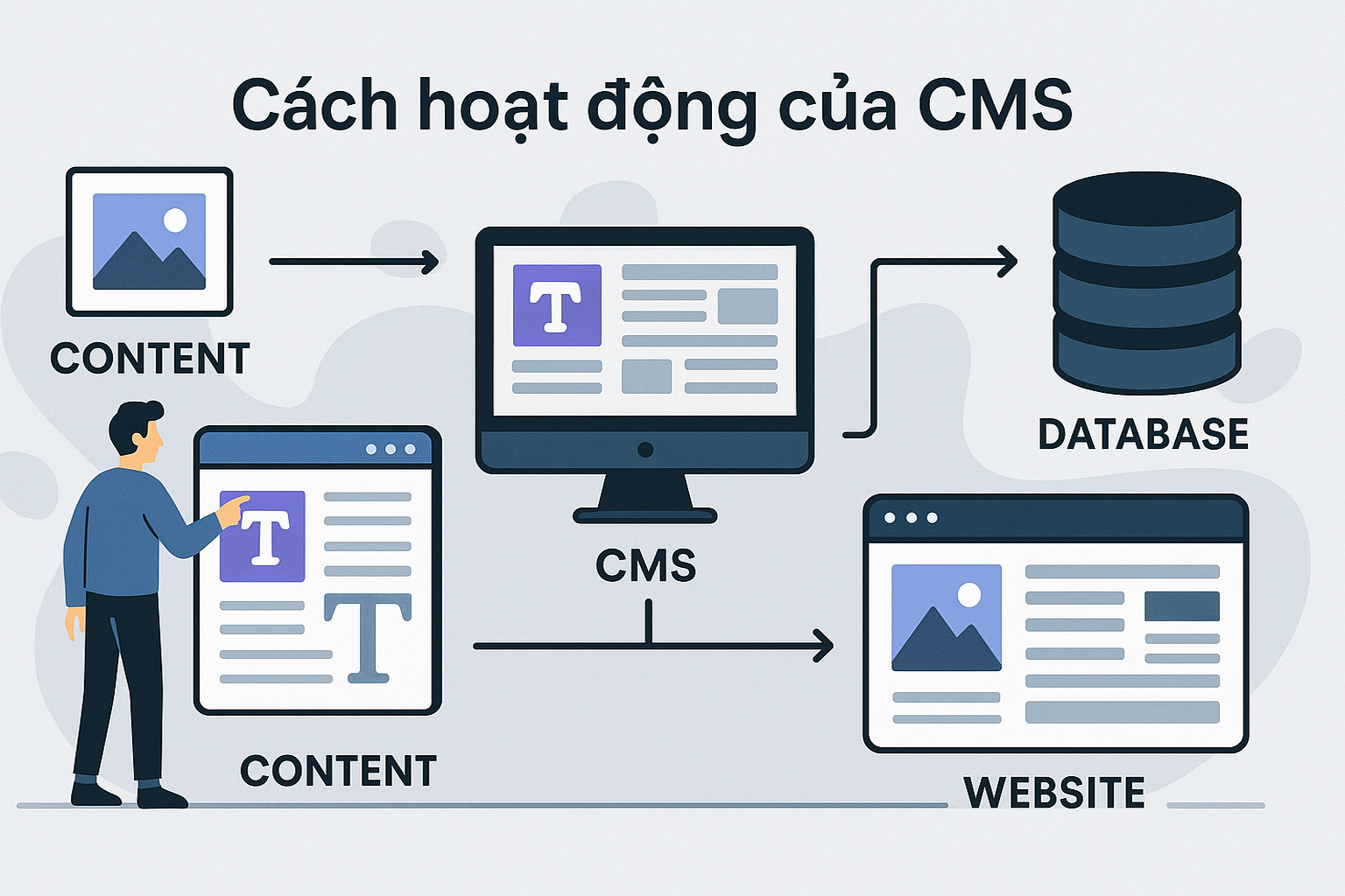 Về cơ bản, CMS (Content Management System) hoạt động như một “trung tâm quản lý” giúp lưu trữ, tổ chức và hiển thị nội dung trên website hoặc ứng dụng web. Tất cả dữ liệu như văn bản, hình ảnh, video, sản phẩm… sẽ được lưu trong cơ sở dữ liệu (database). Khi người dùng truy cập website, CMS sẽ truy xuất và xử lý thông tin từ cơ sở dữ liệu, sau đó hiển thị chúng dưới dạng giao diện hoàn chỉnh mà khách truy cập có thể nhìn thấy.