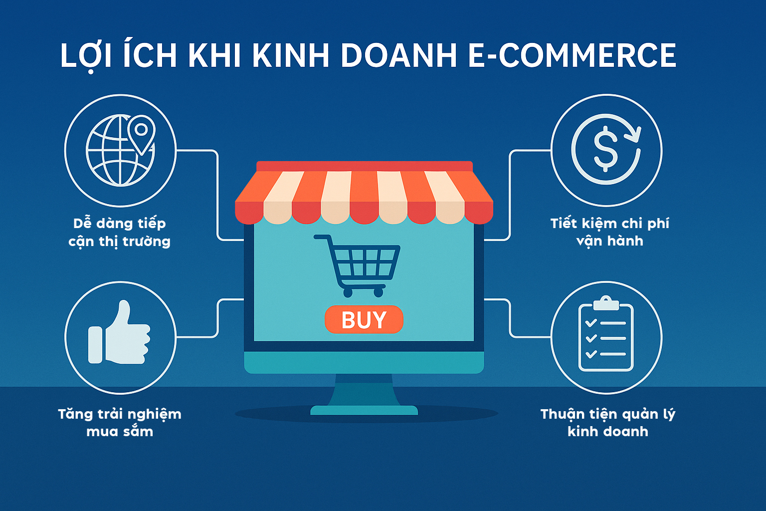 Tóm lại: Kinh doanh E-Commerce mang đến lợi ích toàn diện: mở rộng thị trường, tiết kiệm chi phí, tối ưu trải nghiệm khách hàng và tăng hiệu quả quản lý.