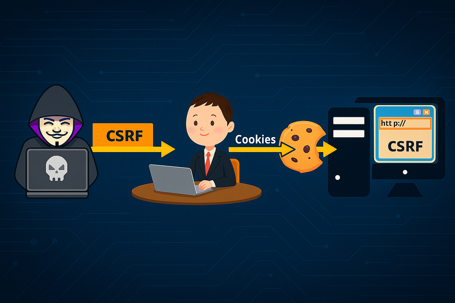 CSRF (Cross-Site Request Forgery) khai thác cơ chế hoạt động tự động của trình duyệt khi gửi yêu cầu đến máy chủ. Cụ thể, mỗi khi người dùng truy cập một website và đã đăng nhập, trình duyệt sẽ tự động đính kèm cookie phiên (session cookie) vào mọi yêu cầu HTTP gửi đến website đó. Đây chính là điểm yếu khiến CSRF có thể xảy ra.