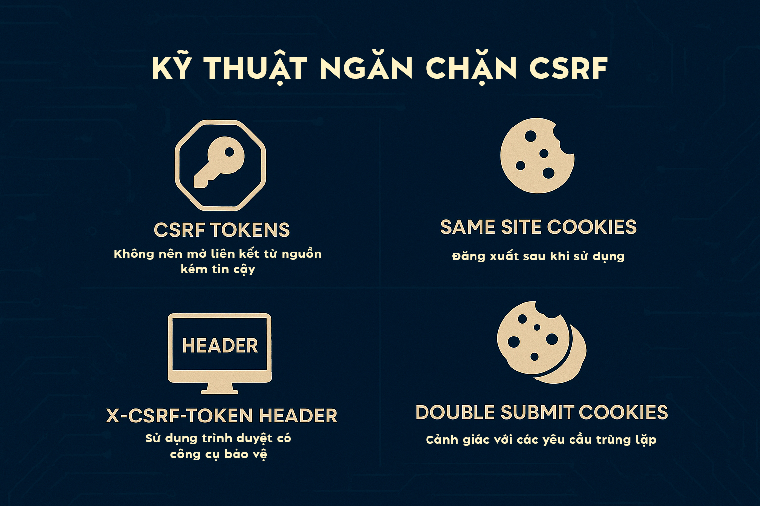 • CSRF Token – mã xác thực ngẫu nhiên gắn với phiên người dùng