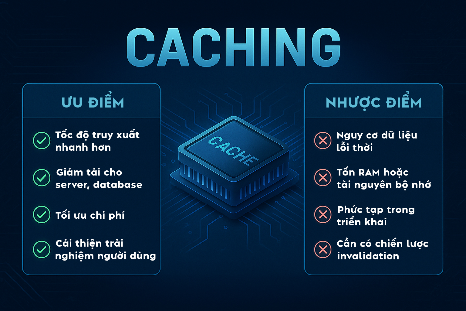 Cần chiến lược invalidation tốt (xóa hoặc cập nhật cache đúng lúc).