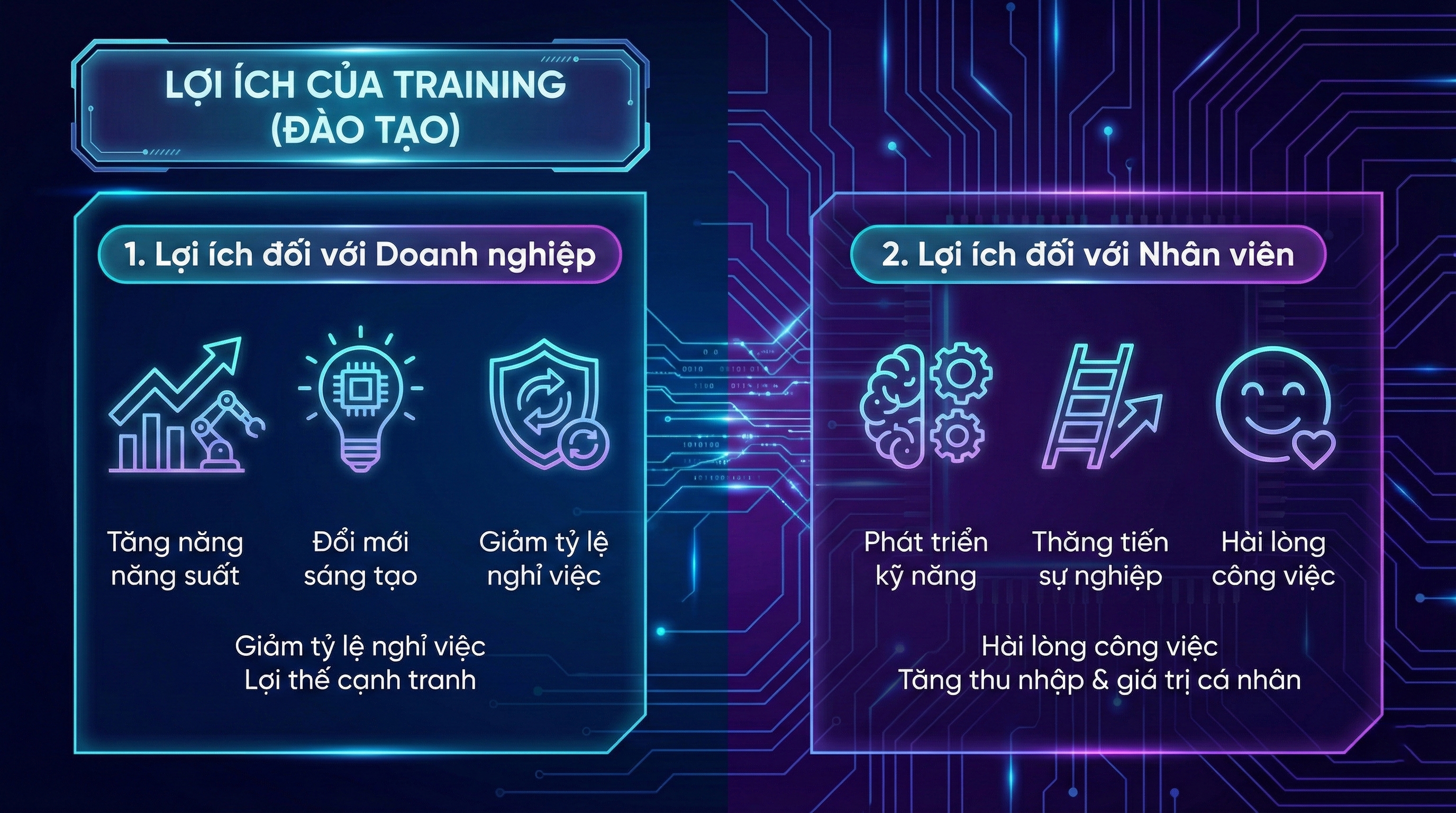 Hoạt động đào tạo nhân sự (Training) không chỉ mang lại giá trị cho riêng doanh nghiệp hay người lao động, mà còn tạo nên sự phát triển bền vững cho cả hai phía. Dưới đây là những lợi ích nổi bật nhất.