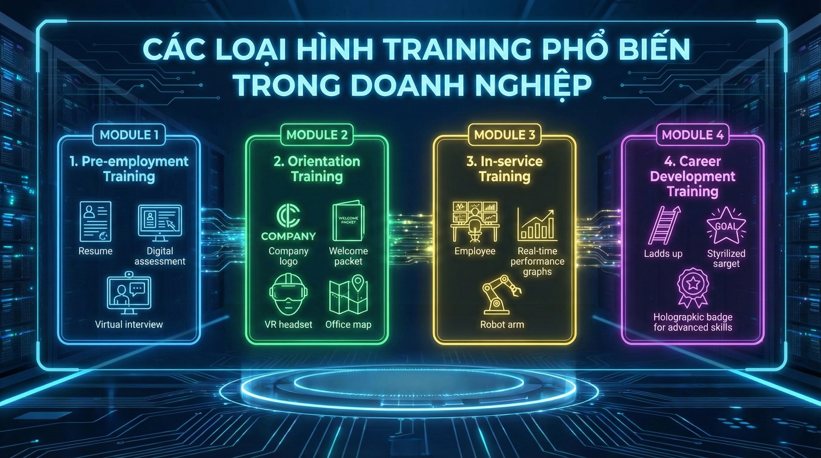 Để đảm bảo nhân viên có đủ kiến thức và kỹ năng cần thiết cho công việc, doanh nghiệp thường triển khai nhiều hình thức đào tạo khác nhau. Mỗi loại hình Training phục vụ một mục đích riêng, tùy vào giai đoạn làm việc và nhu cầu phát triển của nhân sự. Dưới đây là những loại hình đào tạo phổ biến nhất hiện nay: