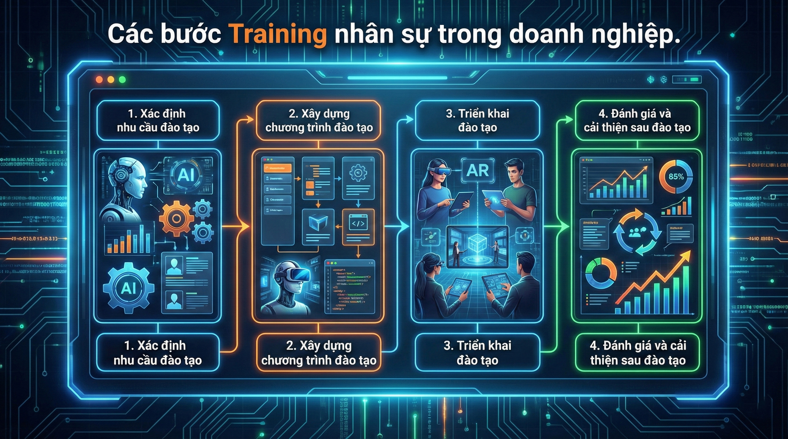 Để xây dựng một chương trình đào tạo hiệu quả, doanh nghiệp cần triển khai theo một quy trình rõ ràng và khoa học. Dưới đây là 4 bước Training nhân sự phổ biến và chuẩn nhất hiện nay.