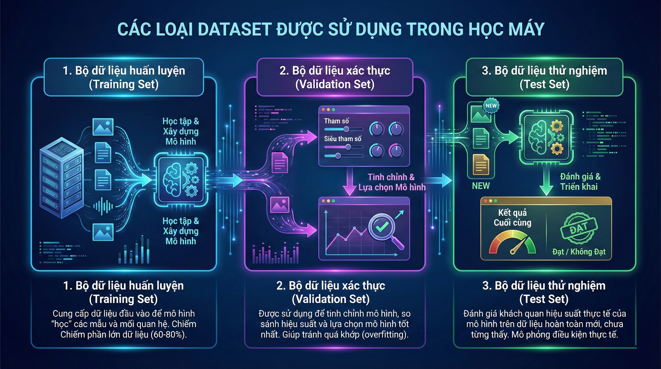 Trong đó, validation set đặc biệt quan trọng vì nó giúp kiểm soát hiện tượng overfitting và hỗ trợ chọn ra phiên bản mô hình cuối cùng hoạt động tốt nhất.