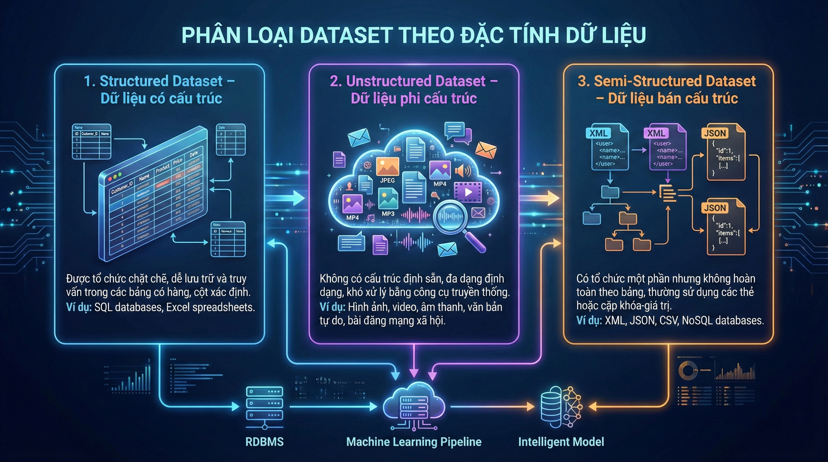 Trong học máy, việc hiểu rõ đặc tính của từng dạng dữ liệu là yếu tố quan trọng giúp lựa chọn thuật toán phù hợp và tối ưu hiệu suất mô hình. Dataset thường được chia thành ba nhóm chính dựa trên đặc tính cấu trúc của dữ liệu: dữ liệu có cấu trúc, dữ liệu phi cấu trúc, và dữ liệu bán cấu trúc.