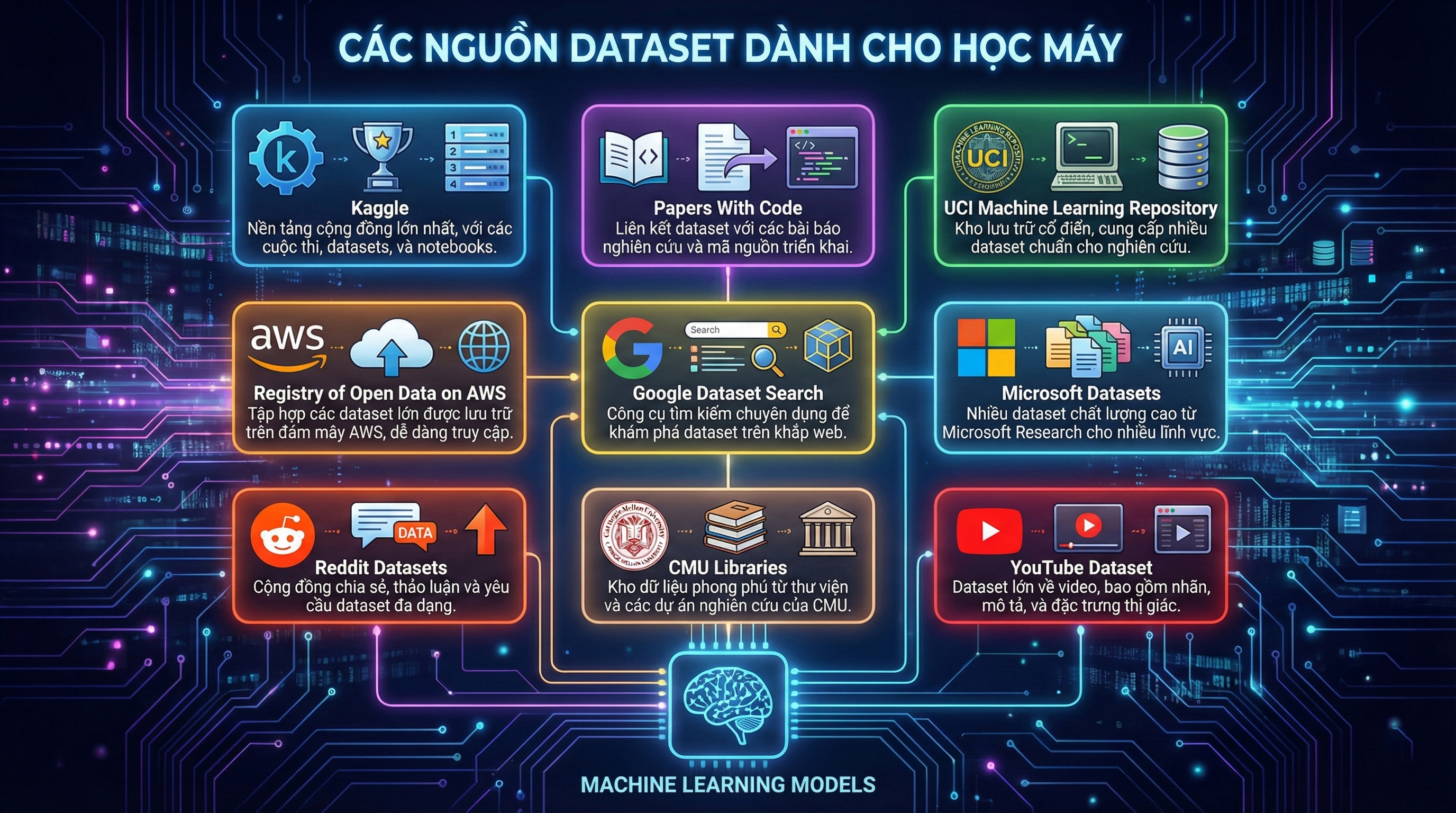 Để xây dựng các mô hình học máy hiệu quả, việc tiếp cận những nguồn dữ liệu đáng tin cậy là vô cùng quan trọng. Dưới đây là những kho dataset uy tín và phổ biến nhất mà các nhà nghiên cứu, lập trình viên và kỹ sư AI thường sử dụng.