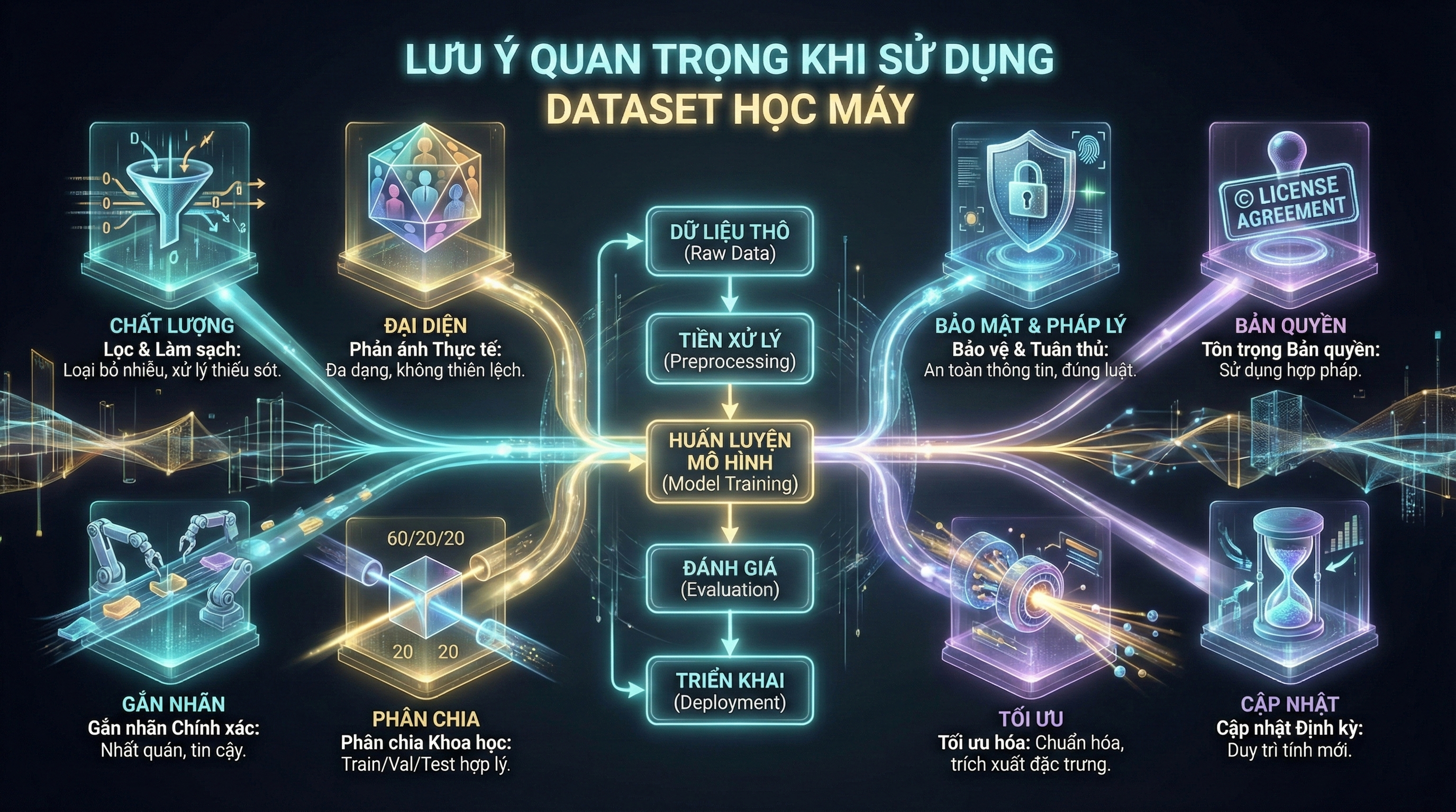 Việc sử dụng dataset trong học máy không chỉ đơn giản là tải dữ liệu về và đưa vào mô hình. Để đảm bảo kết quả chính xác và mô hình hoạt động ổn định, bạn cần tuân thủ một số nguyên tắc và lưu ý quan trọng dưới đây.