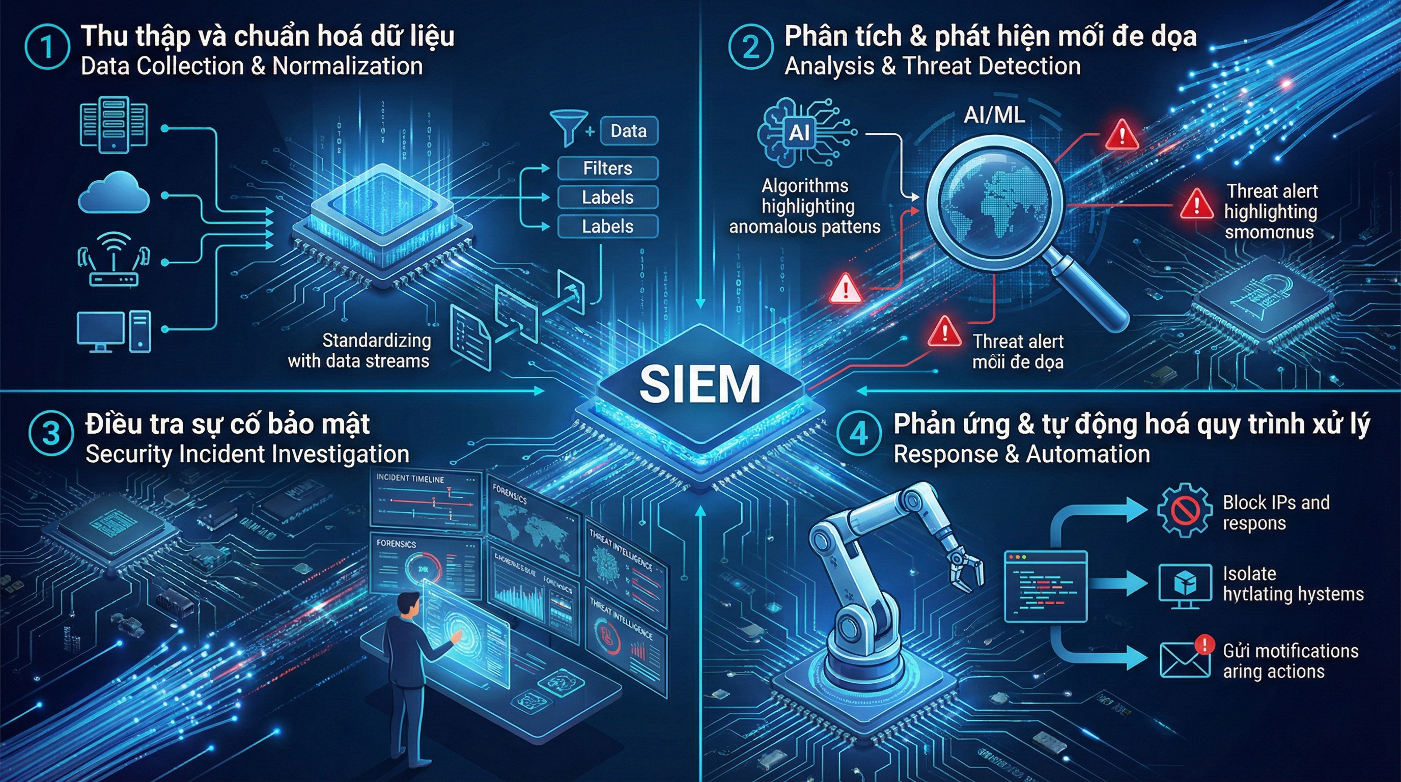 Để bảo vệ hệ thống trước các mối nguy ngày càng tinh vi, SIEM vận hành theo một quy trình liên tục gồm nhiều giai đoạn: thu thập dữ liệu, phân tích – phát hiện đe doạ, điều tra và tự động phản ứng. Dưới đây là cách SIEM hoạt động một cách toàn diện trong môi trường doanh nghiệp.