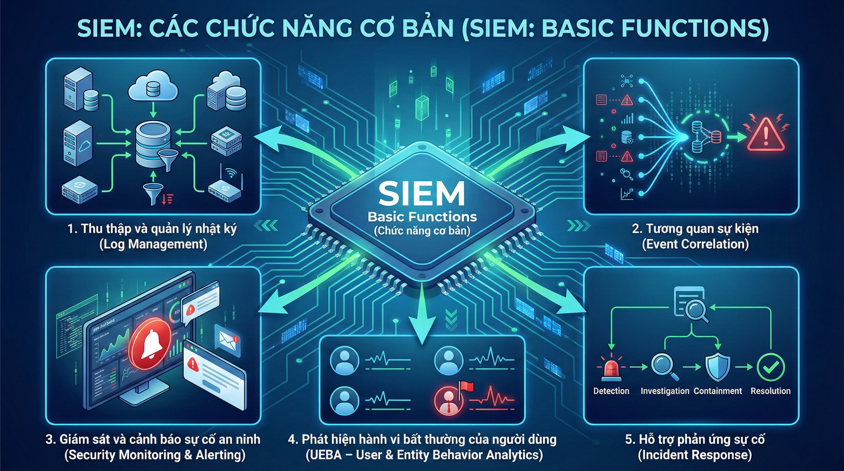 SIEM là nền tảng bảo mật hợp nhất, cung cấp nhiều chức năng quan trọng giúp doanh nghiệp giám sát hạ tầng, phát hiện mối đe doạ và phản ứng nhanh với sự cố. Dưới đây là các chức năng cốt lõi mà một hệ thống SIEM tiêu chuẩn cần có: