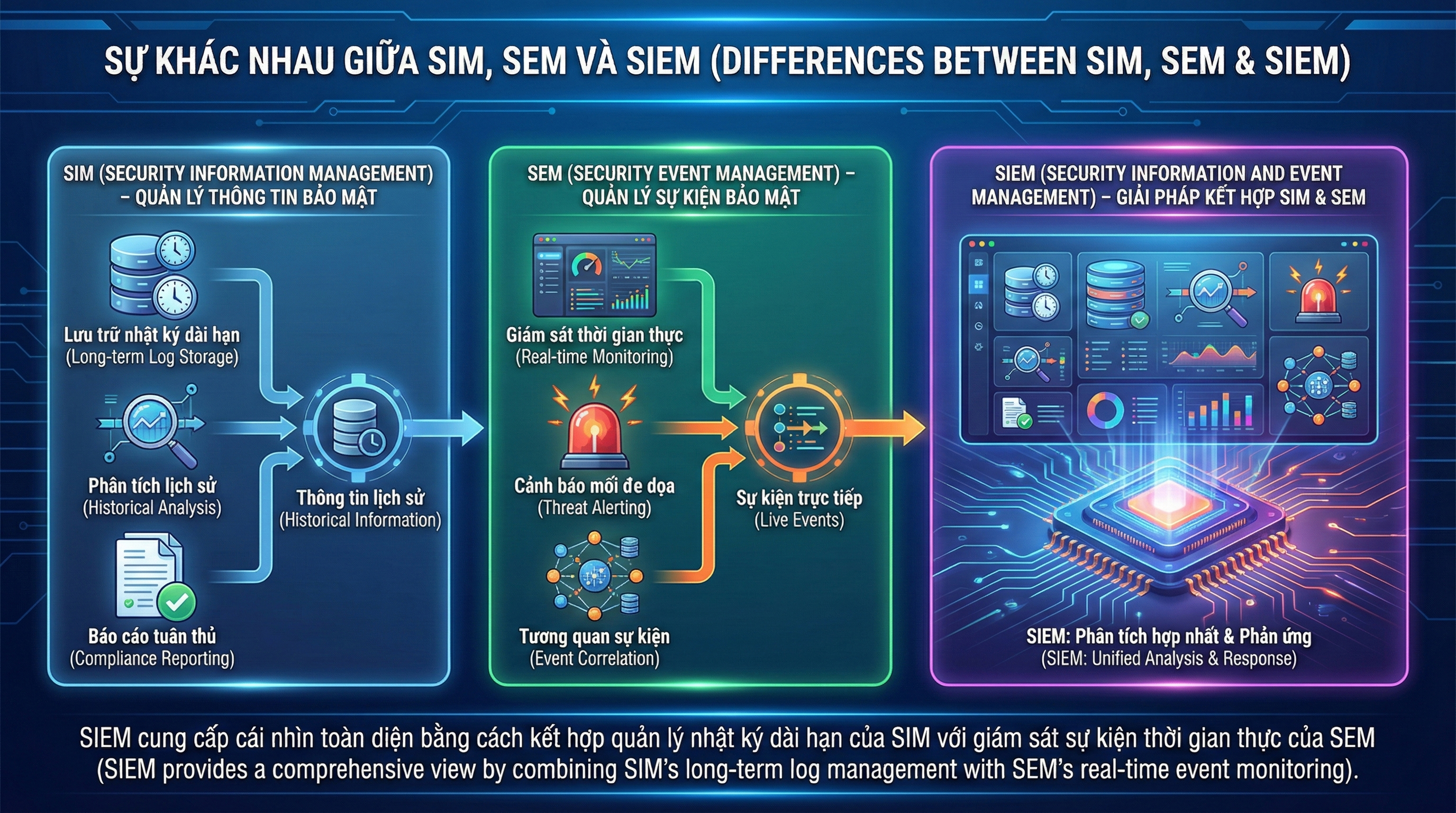 Trong lĩnh vực an ninh mạng, SIM, SEM và SIEM là ba thuật ngữ thường xuyên được nhắc đến. Mặc dù liên quan chặt chẽ với nhau, nhưng mỗi công nghệ lại đảm nhiệm một vai trò khác nhau trong việc thu thập, giám sát và phân tích dữ liệu bảo mật.