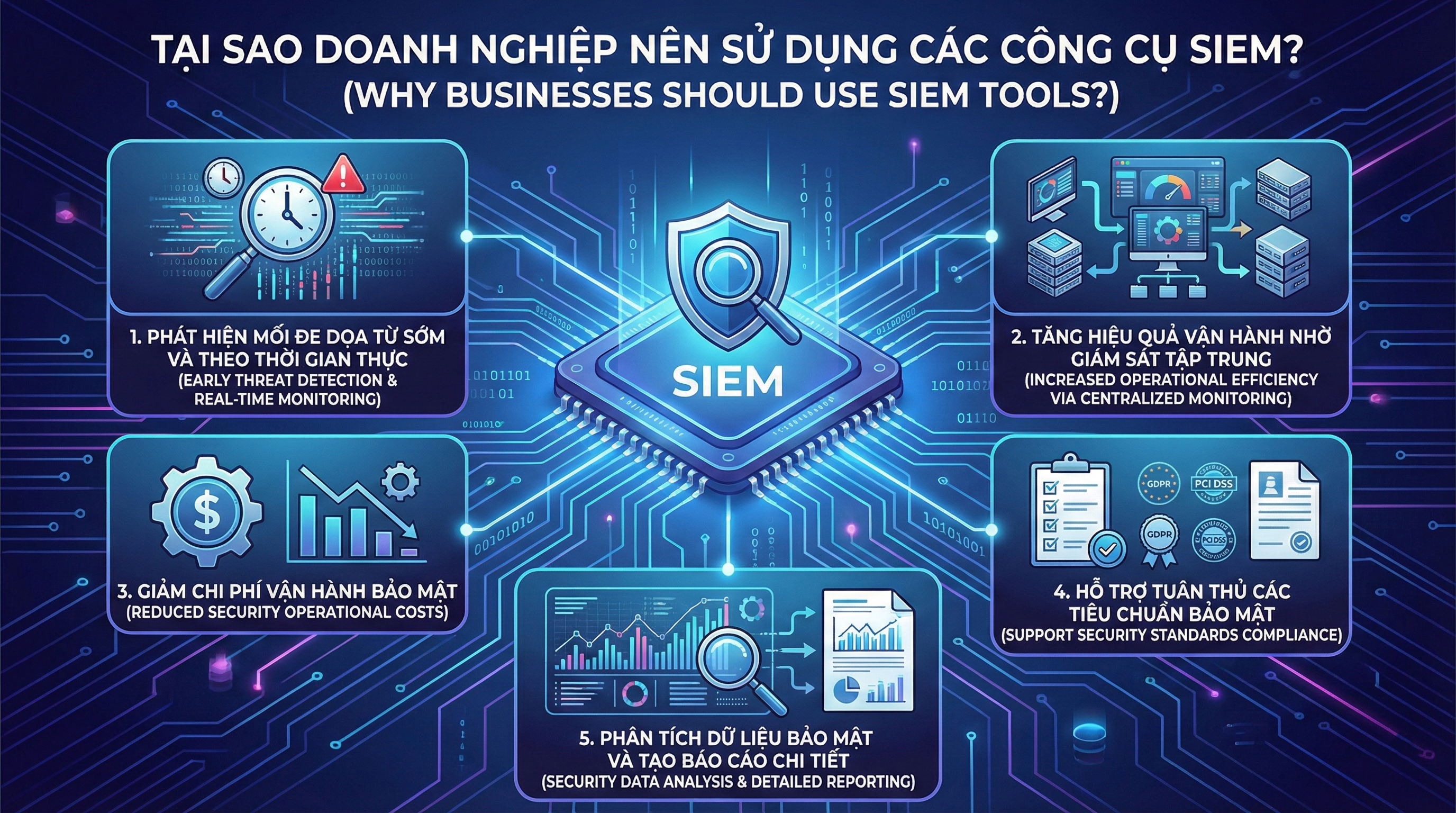 Khi được triển khai và vận hành đúng cách, SIEM không chỉ giúp doanh nghiệp phát hiện mối đe dọa sớm, mà còn giảm thiểu chi phí bảo mật, tăng hiệu quả giám sát và hỗ trợ tuân thủ các tiêu chuẩn quốc tế. Đây chính là nền tảng quan trọng giúp doanh nghiệp xây dựng môi trường CNTT an toàn, ổn định và phát triển bền vững trong kỷ nguyên số.