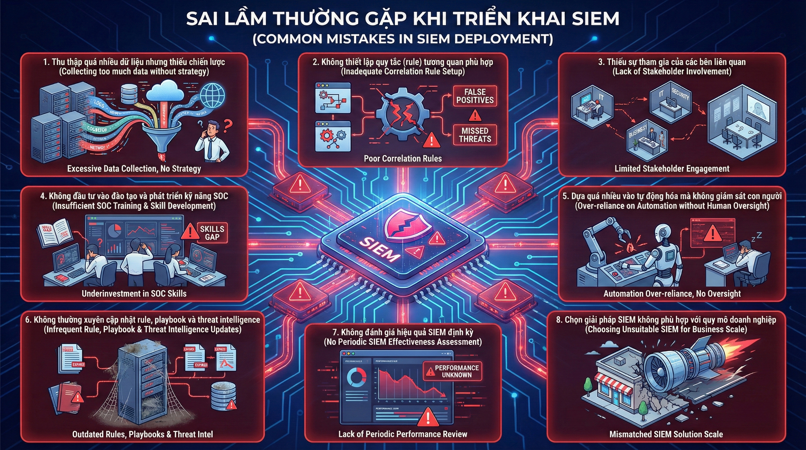 Triển khai SIEM là một dự án phức tạp, đòi hỏi sự phối hợp giữa đội ngũ kỹ thuật, bảo mật và quản trị. Tuy nhiên, nhiều doanh nghiệp thường gặp phải những sai lầm phổ biến khiến dự án SIEM không đạt hiệu quả như mong đợi. Dưới đây là những sai sót thường gặp và lý do khiến chúng trở thành vấn đề nghiêm trọng.
