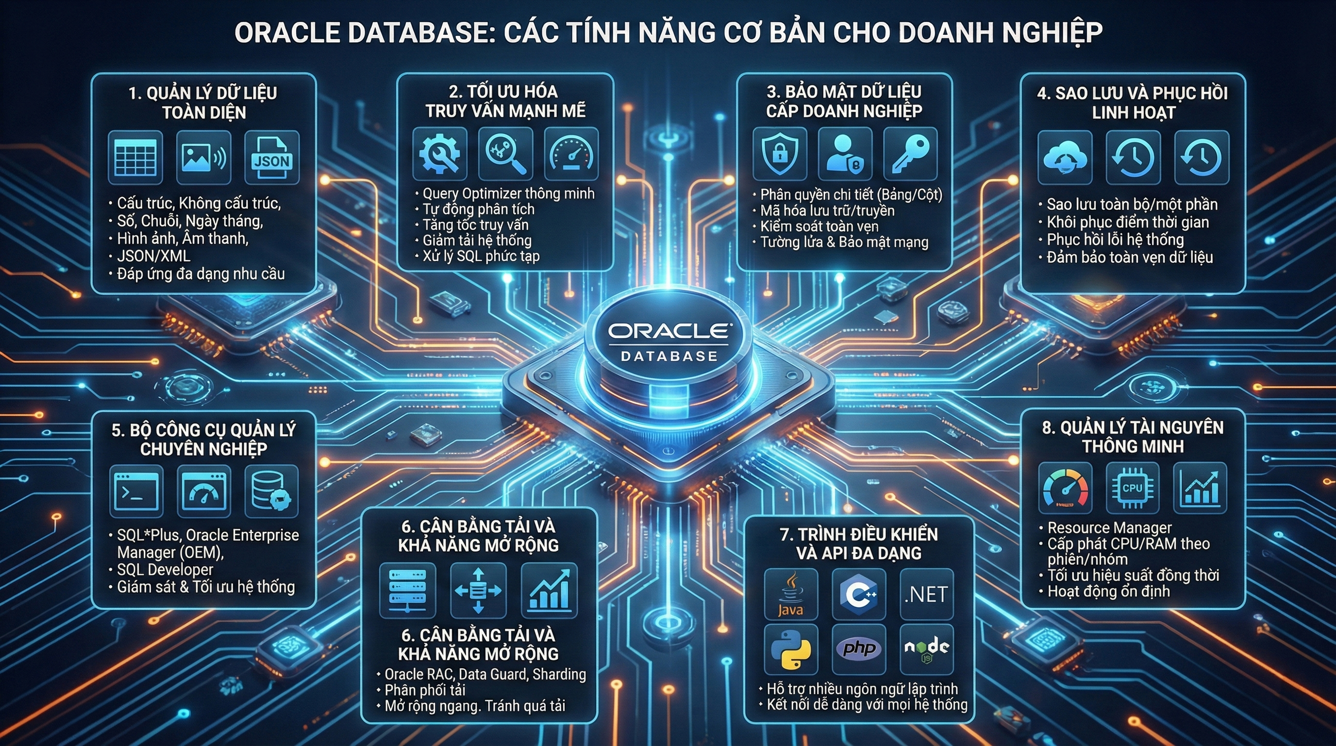 Oracle Database được đánh giá là một trong những hệ quản trị cơ sở dữ liệu mạnh mẽ nhất hiện nay nhờ sở hữu bộ tính năng toàn diện, hỗ trợ tối ưu cho việc lưu trữ, quản trị, bảo mật và xử lý dữ liệu trong doanh nghiệp. Dưới đây là những tính năng nổi bật và quan trọng nhất của Oracle:
