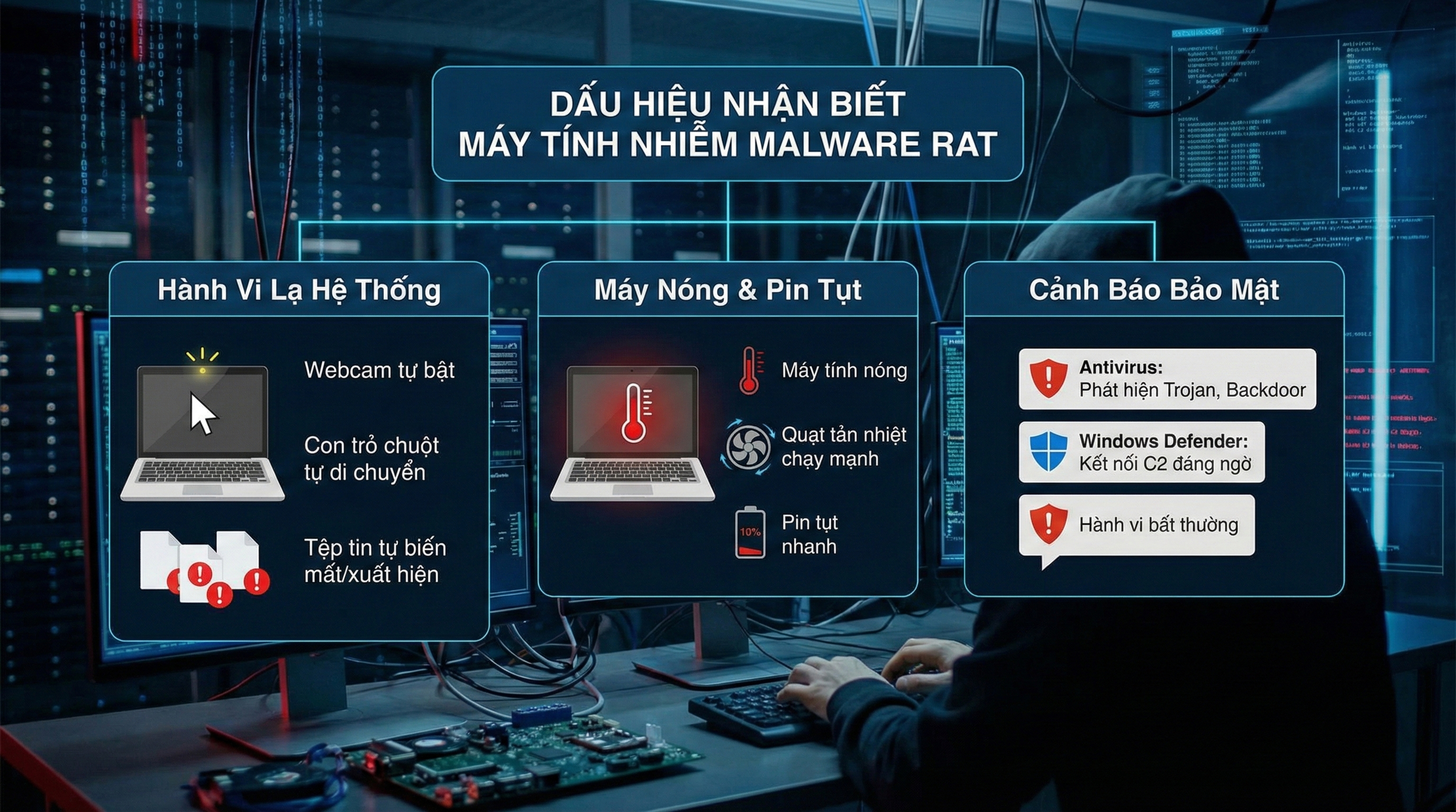 Mặc dù Malware RAT được thiết kế để hoạt động âm thầm, người dùng vẫn có thể phát hiện qua một số biểu hiện bất thường sau:
