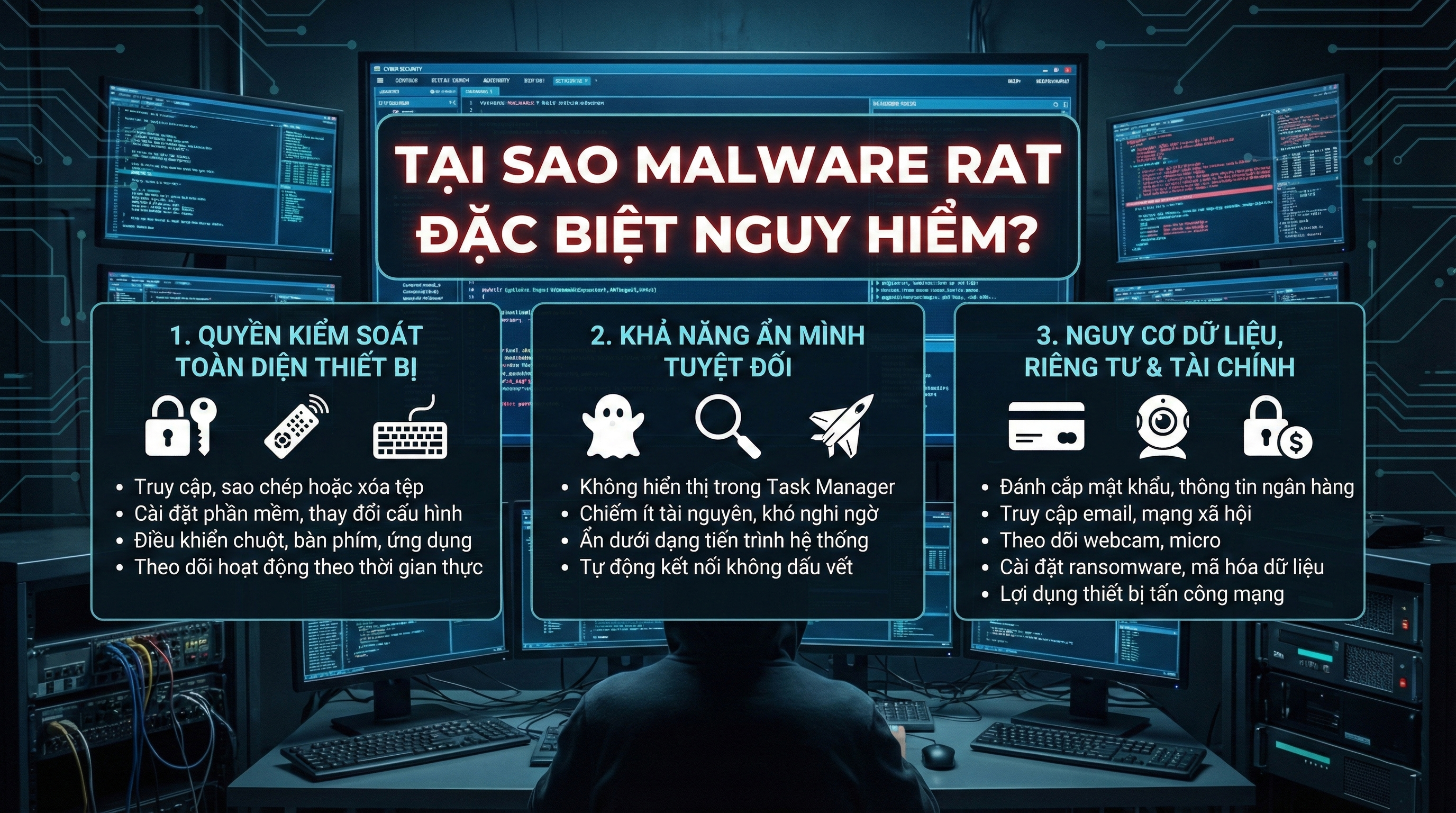 Malware RAT được xem là một trong những dạng mã độc đáng sợ nhất hiện nay bởi nó không chỉ gây hại dữ liệu mà còn chiếm quyền điều khiển toàn bộ thiết bị. Những yếu tố dưới đây khiến RAT trở thành công cụ tấn công nguy hiểm hàng đầu: