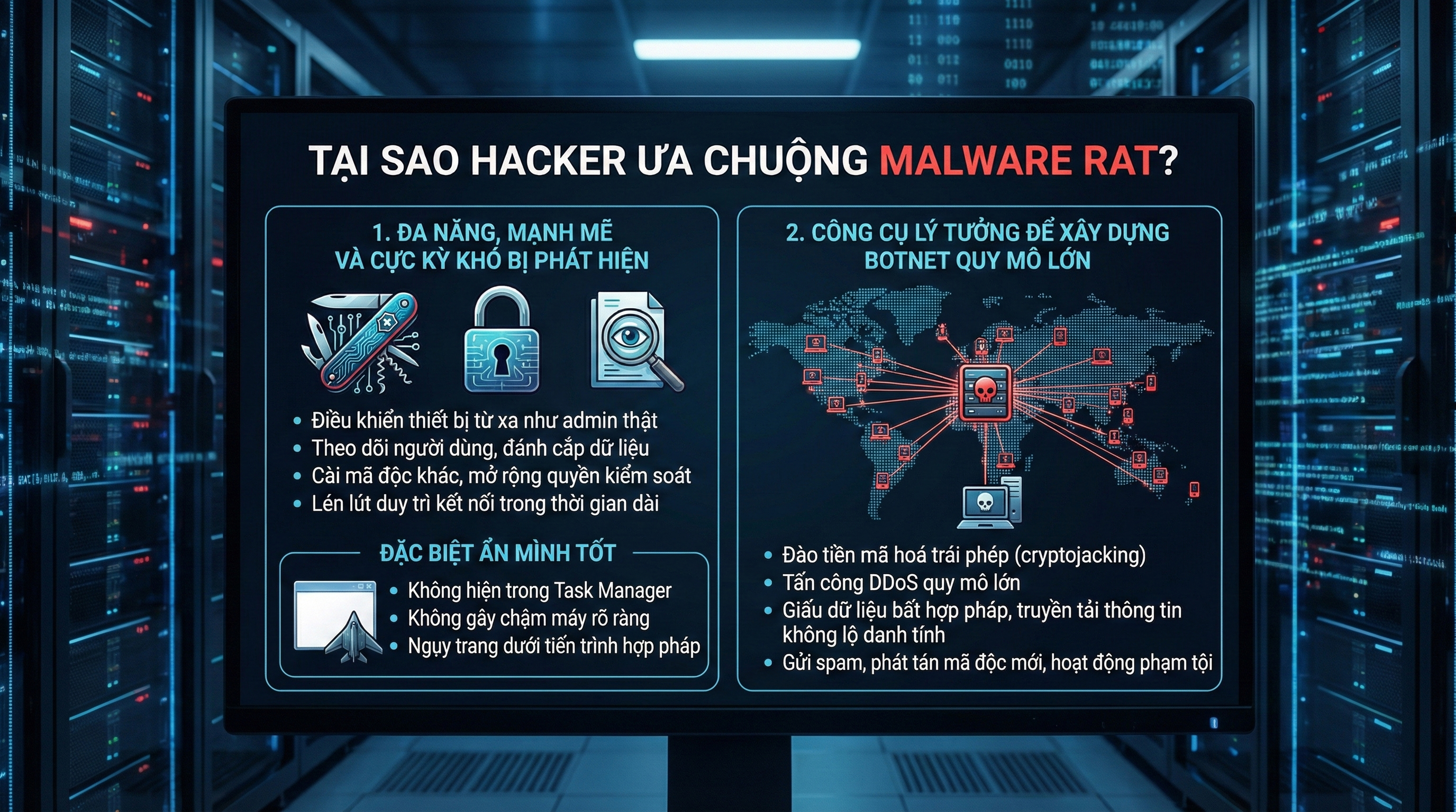 Một trong những lý do chính khiến hacker ưa chuộng RAT là khả năng biến hàng nghìn thiết bị nạn nhân thành botnet – mạng lưới máy tính bị điều khiển từ xa. Botnet mang lại lợi ích khổng lồ trong thế giới ngầm:
