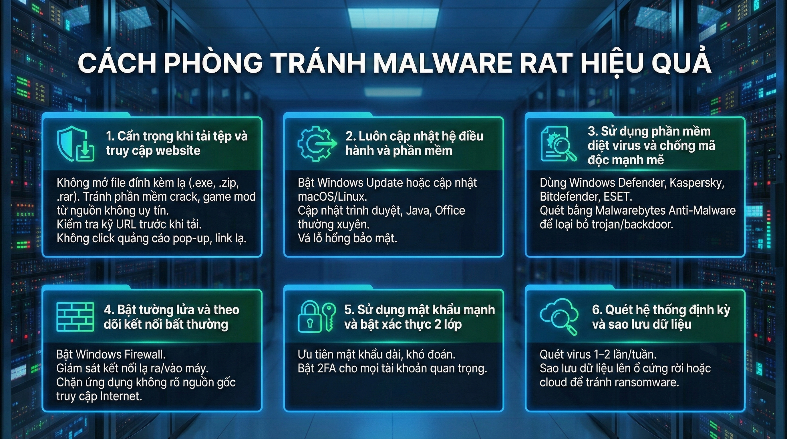 Để bảo vệ máy tính trước các cuộc tấn công bằng Malware RAT, người dùng cần kết hợp nhiều biện pháp an toàn mạng khác nhau. Dưới đây là những cách phòng tránh hiệu quả và thiết thực nhất: