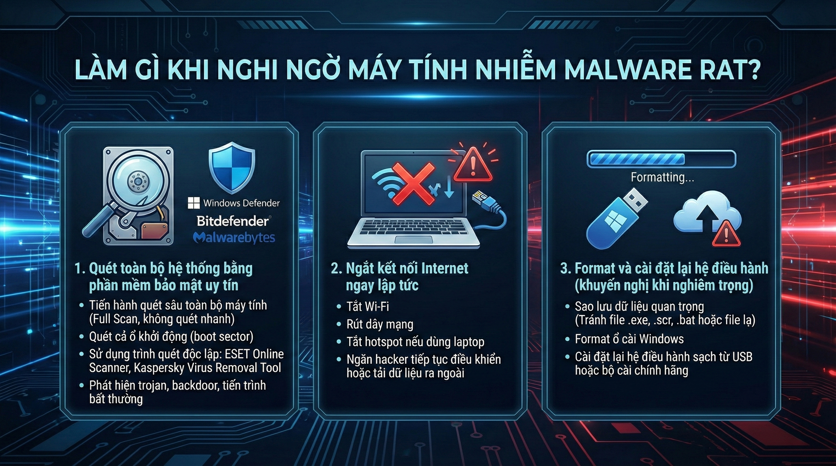 Tuy nhiên, người dùng hoàn toàn có thể tự bảo vệ mình nếu tuân thủ các biện pháp cơ bản như không tải phần mềm lậu, cẩn trọng khi mở file lạ, thường xuyên cập nhật hệ thống, và sử dụng phần mềm bảo mật đáng tin cậy. Trong trường hợp máy tính xuất hiện những dấu hiệu bất thường, việc quét toàn bộ hệ thống, ngắt kết nối Internet, hoặc cài lại hệ điều hành là những giải pháp cần thiết để loại bỏ RAT triệt để.
