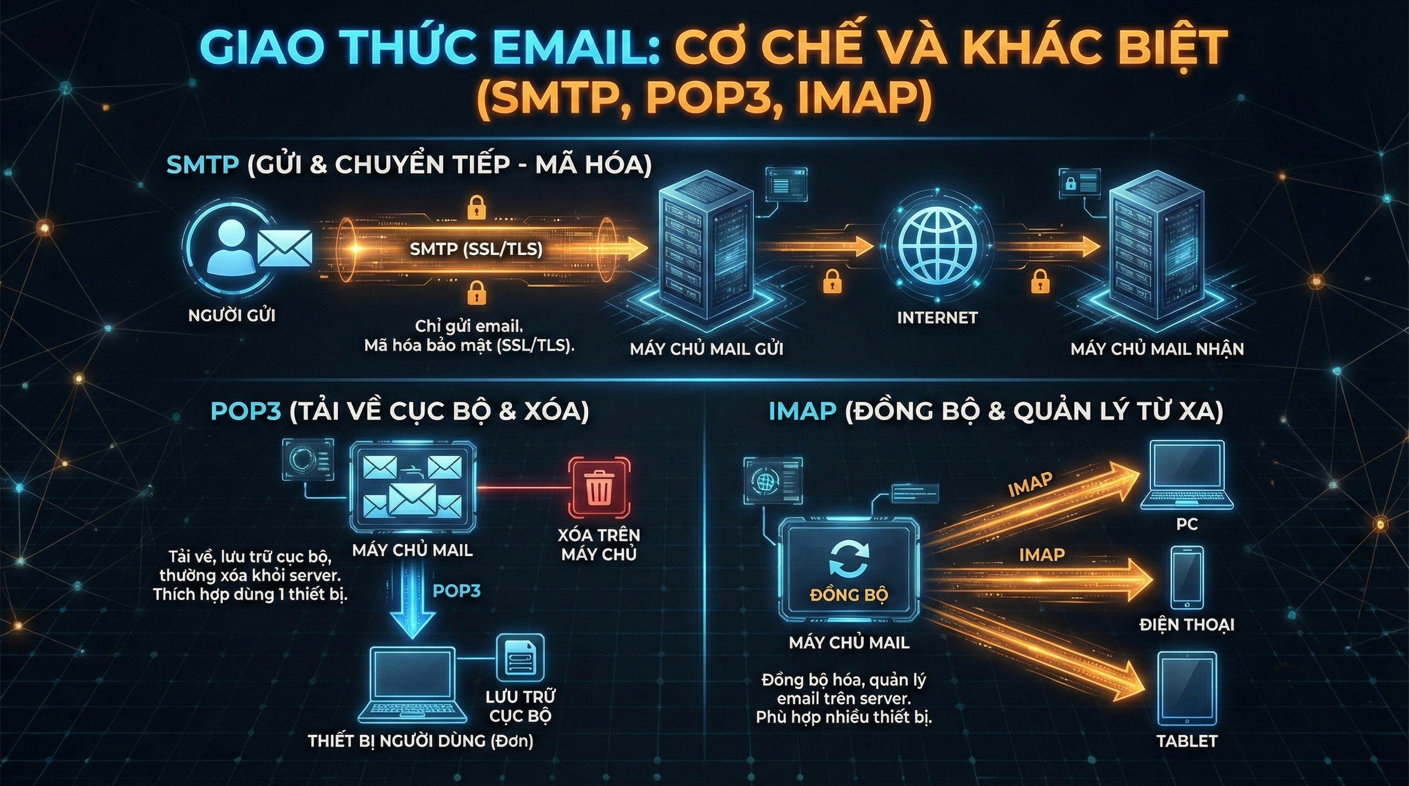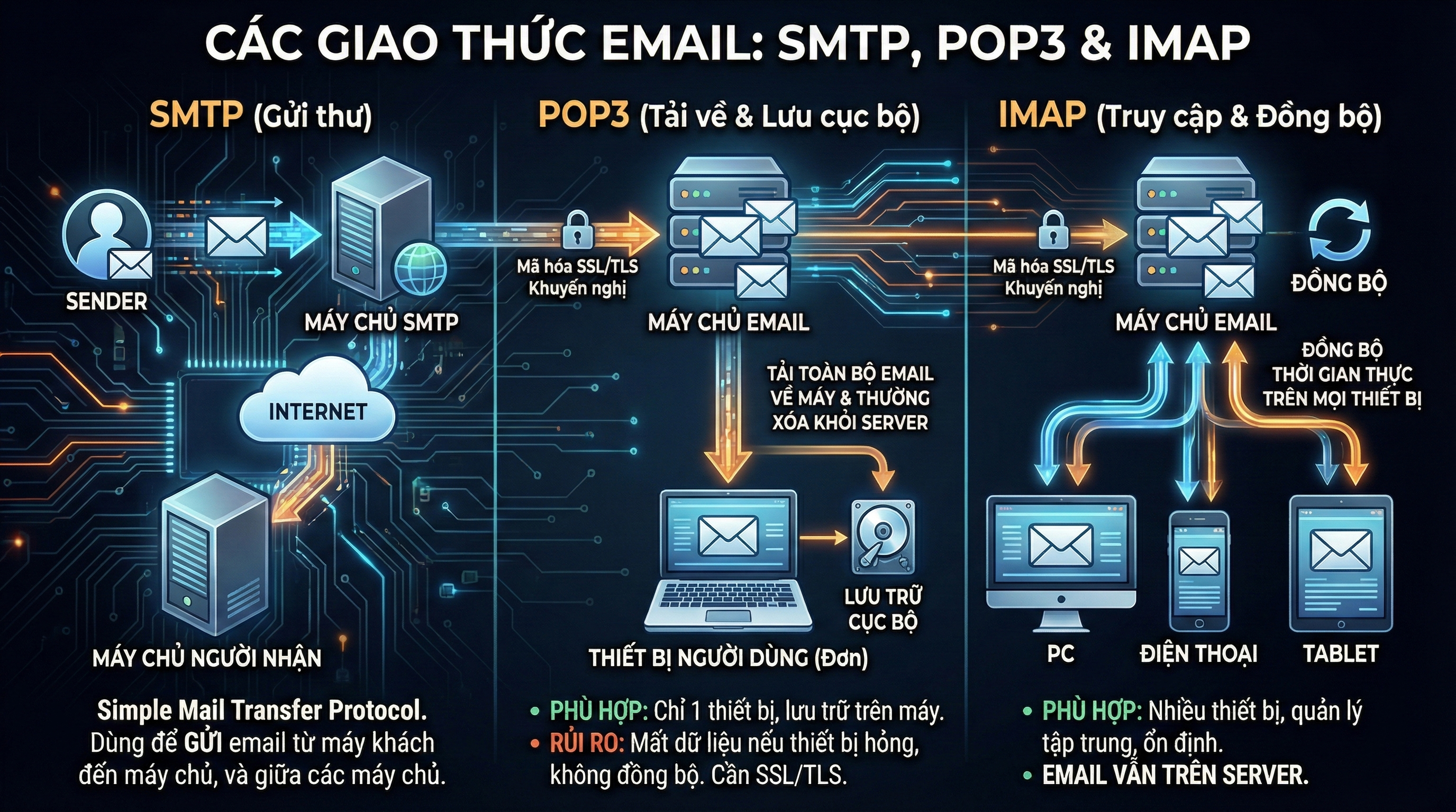 SMTP, POP3 và IMAP là ba giao thức cốt lõi trong hệ thống email, mỗi giao thức đảm nhiệm một vai trò riêng biệt trong quá trình gửi, nhận và quản lý thư điện tử. Chúng phối hợp với nhau để đảm bảo email được truyền tải chính xác và thuận tiện cho người dùng.
