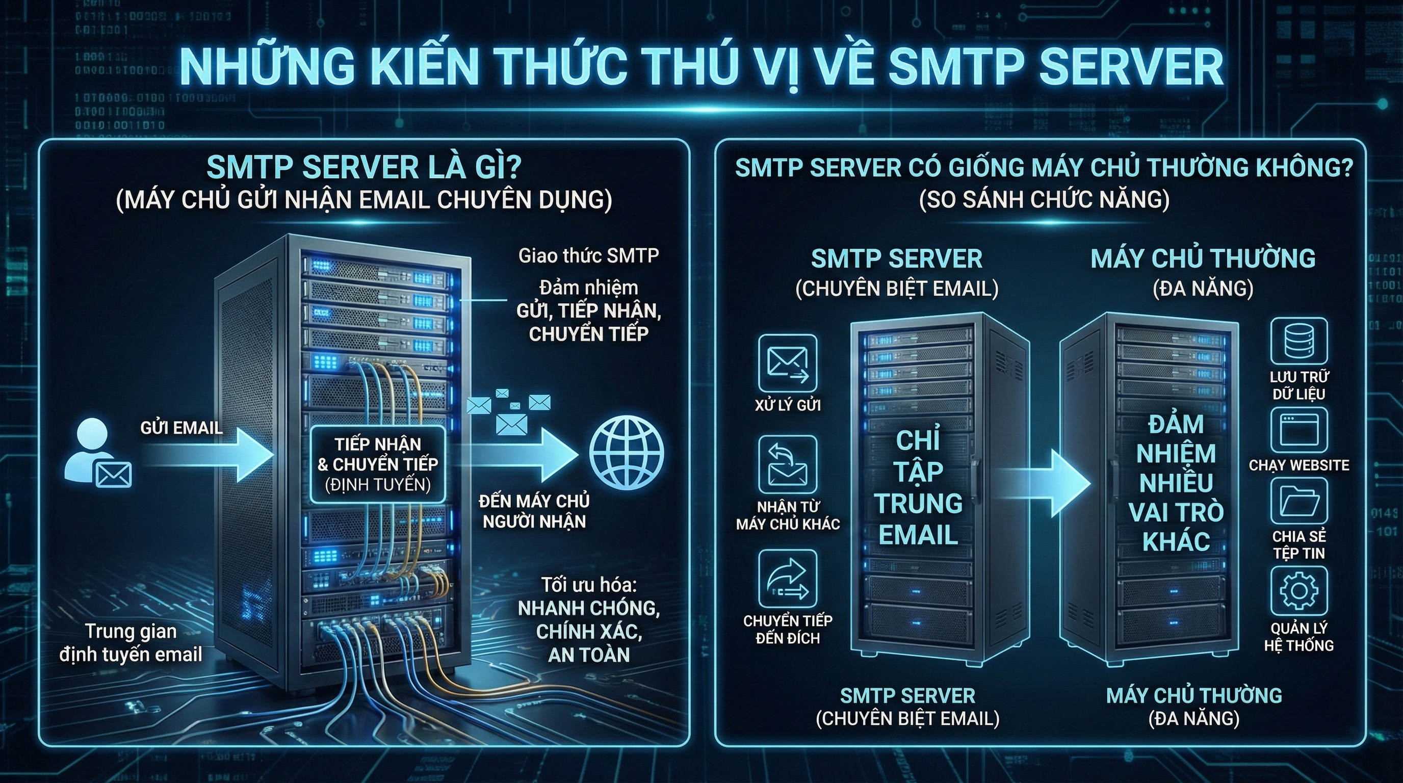 Không giống với cách hiểu thông thường về máy chủ đa năng, SMTP Server được thiết kế tối ưu riêng cho hệ thống email, tập trung vào việc đảm bảo email được gửi đi nhanh chóng, chính xác và an toàn trong môi trường Internet.