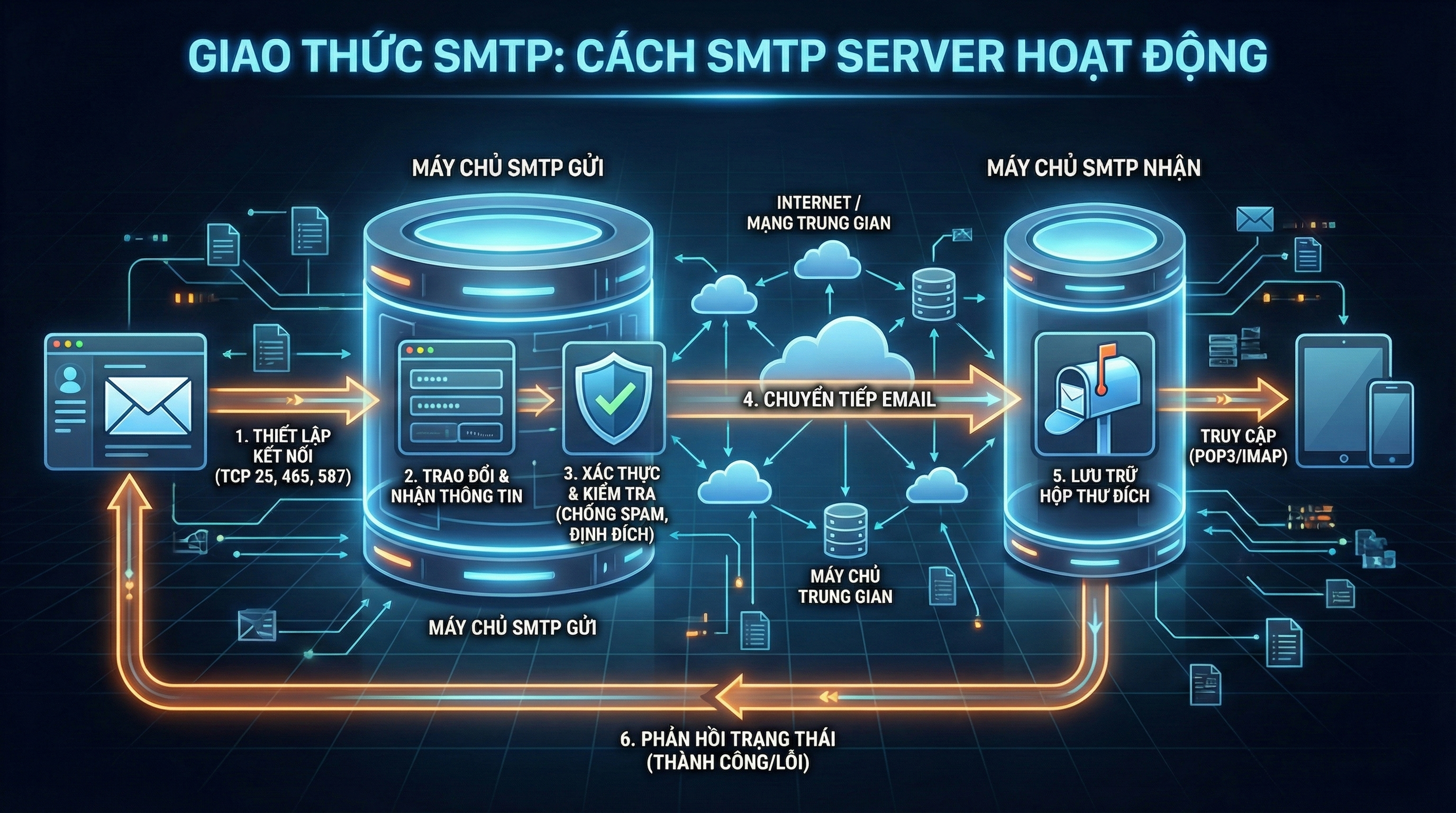 Về bản chất, SMTP hoạt động theo cơ chế truyền và chuyển tiếp thư điện tử giữa các máy chủ trong mạng. Email sau khi được tạo sẽ được gửi đến máy chủ SMTP của người gửi, sau đó tiếp tục được định tuyến và chuyển qua một hoặc nhiều máy chủ trung gian trước khi đến máy chủ SMTP đích. Quá trình này diễn ra tự động, đảm bảo email được phân phối chính xác ngay cả khi hệ thống phải xử lý qua nhiều tầng mạng khác nhau.
