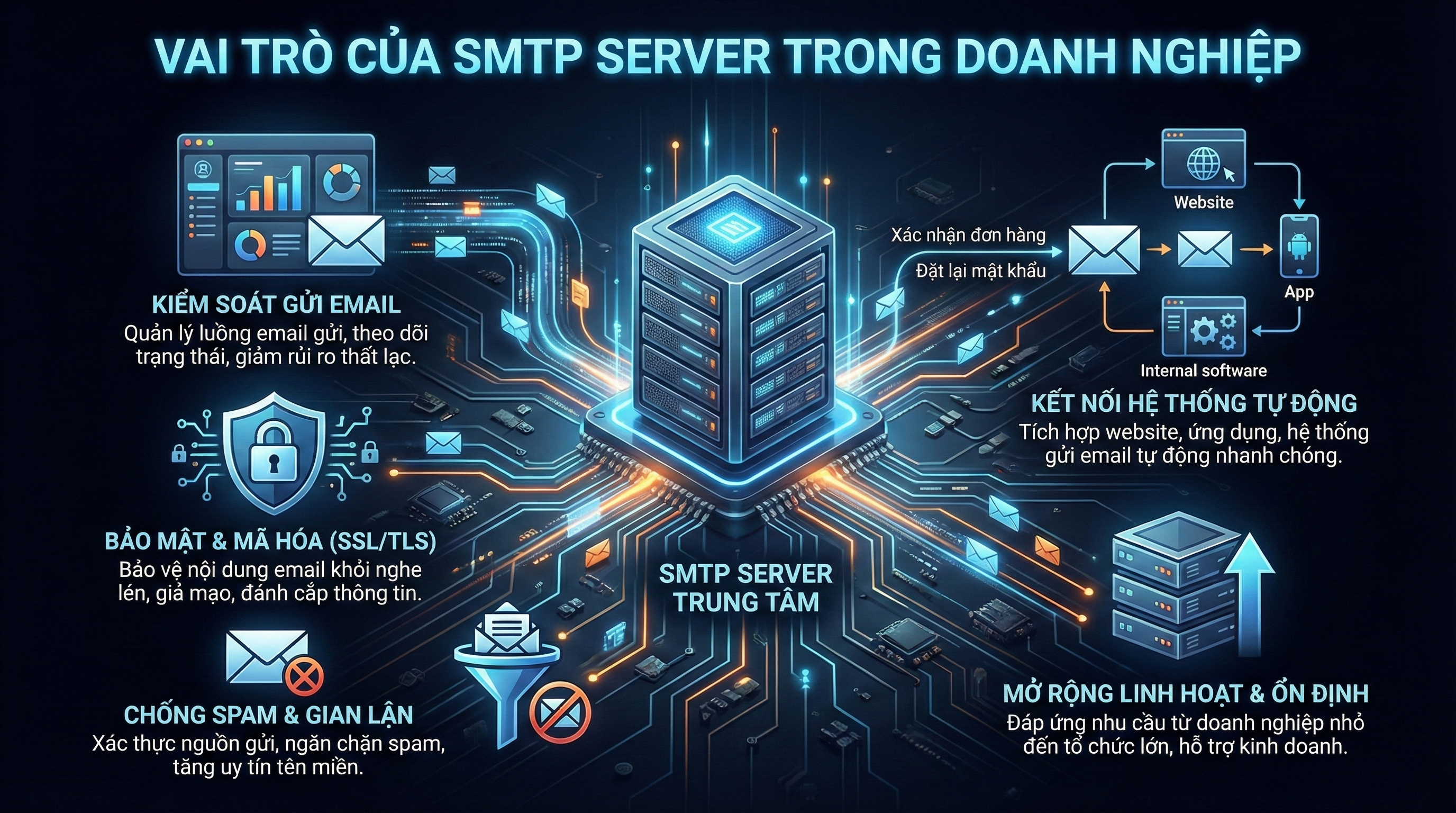 Trước hết, SMTP Server giúp doanh nghiệp kiểm soát toàn bộ quá trình gửi email. Từ email giao dịch, thông báo hệ thống cho đến email chăm sóc khách hàng, tất cả đều được xử lý và chuyển tiếp thông qua SMTP Server. Điều này giúp doanh nghiệp chủ động quản lý số lượng email gửi ra, theo dõi trạng thái gửi và giảm thiểu rủi ro thất lạc thư.