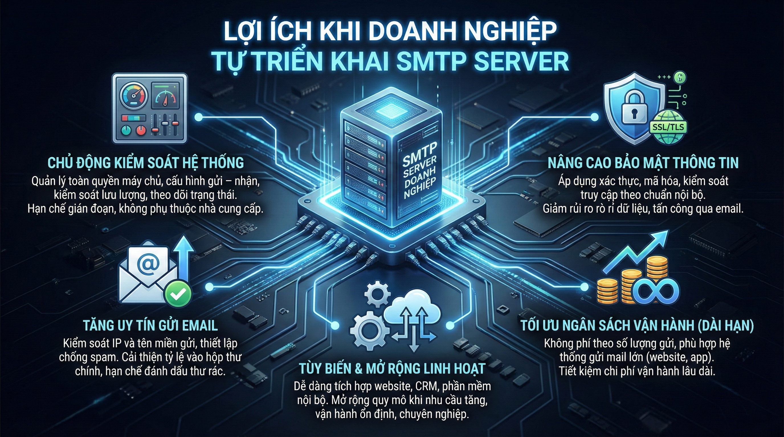 Việc tự triển khai SMTP Server mang lại nhiều lợi ích thiết thực cho doanh nghiệp, đặc biệt trong bối cảnh email vẫn là kênh giao tiếp và vận hành quan trọng. Thay vì phụ thuộc hoàn toàn vào dịch vụ email bên thứ ba, doanh nghiệp có thể chủ động xây dựng một hệ thống gửi email ổn định và linh hoạt hơn.