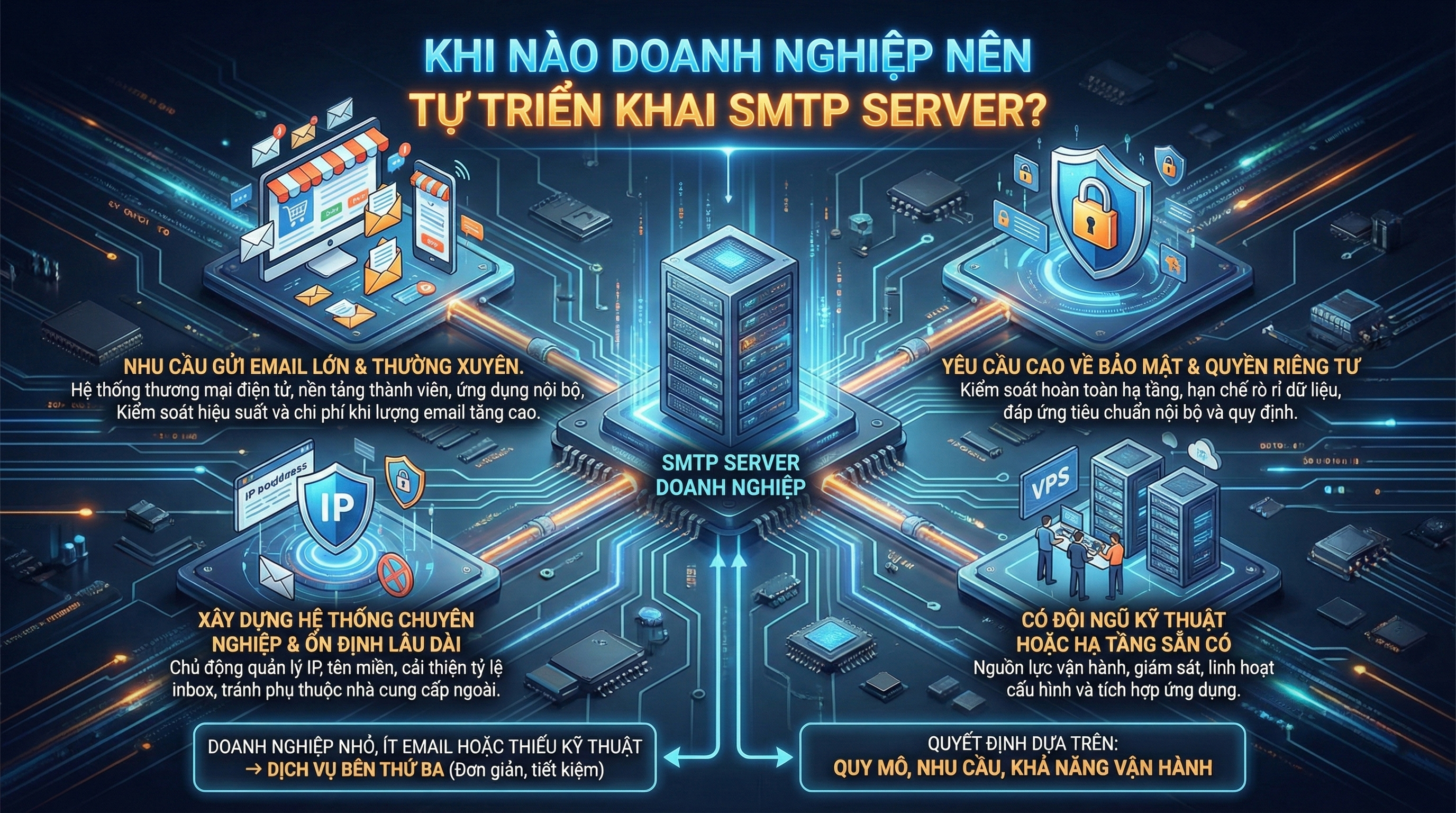 Không phải doanh nghiệp nào cũng cần tự xây dựng SMTP Server ngay từ đầu. Tuy nhiên, trong một số trường hợp cụ thể, việc tự triển khai sẽ mang lại hiệu quả rõ rệt so với việc sử dụng dịch vụ email bên thứ ba.