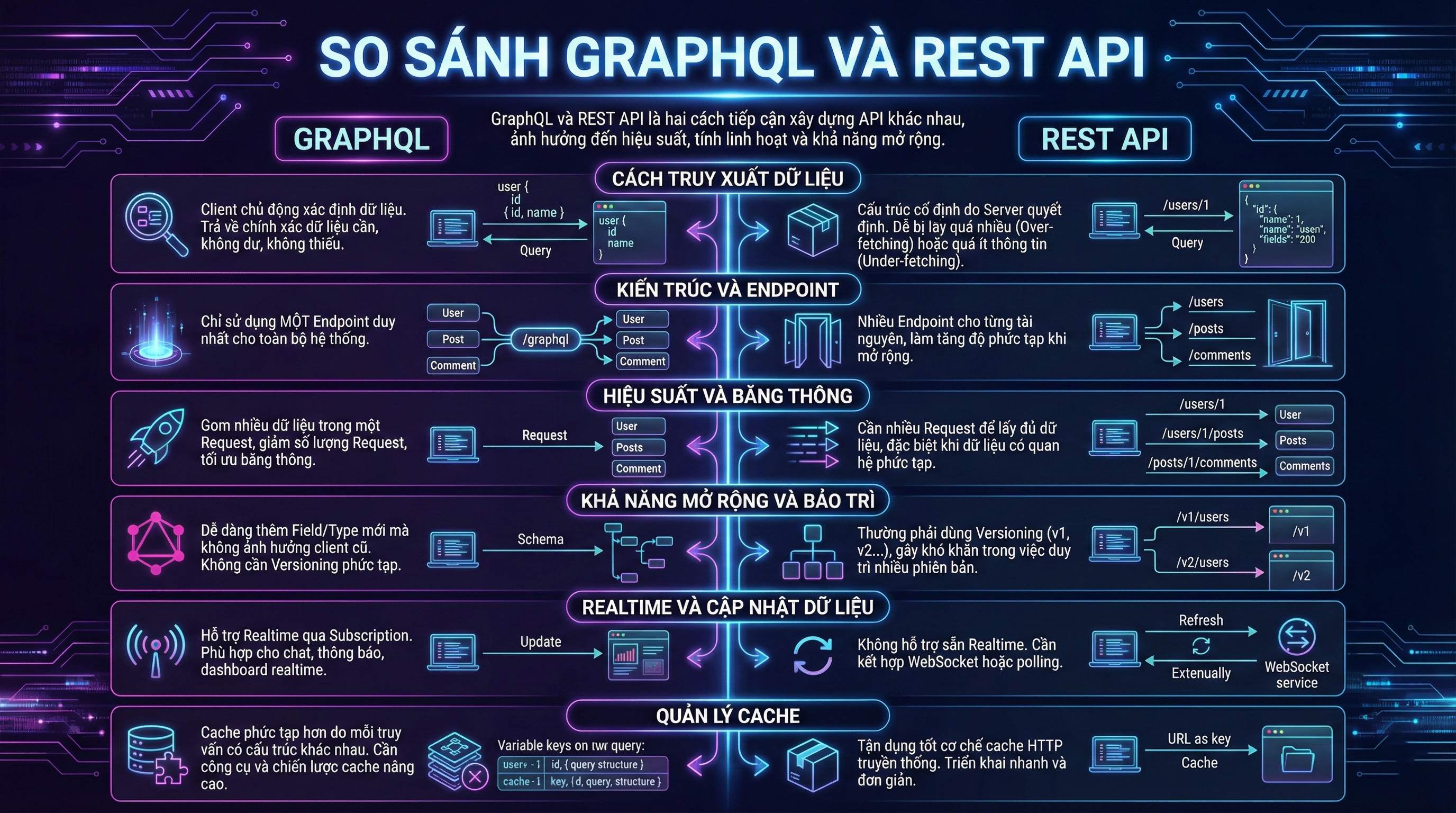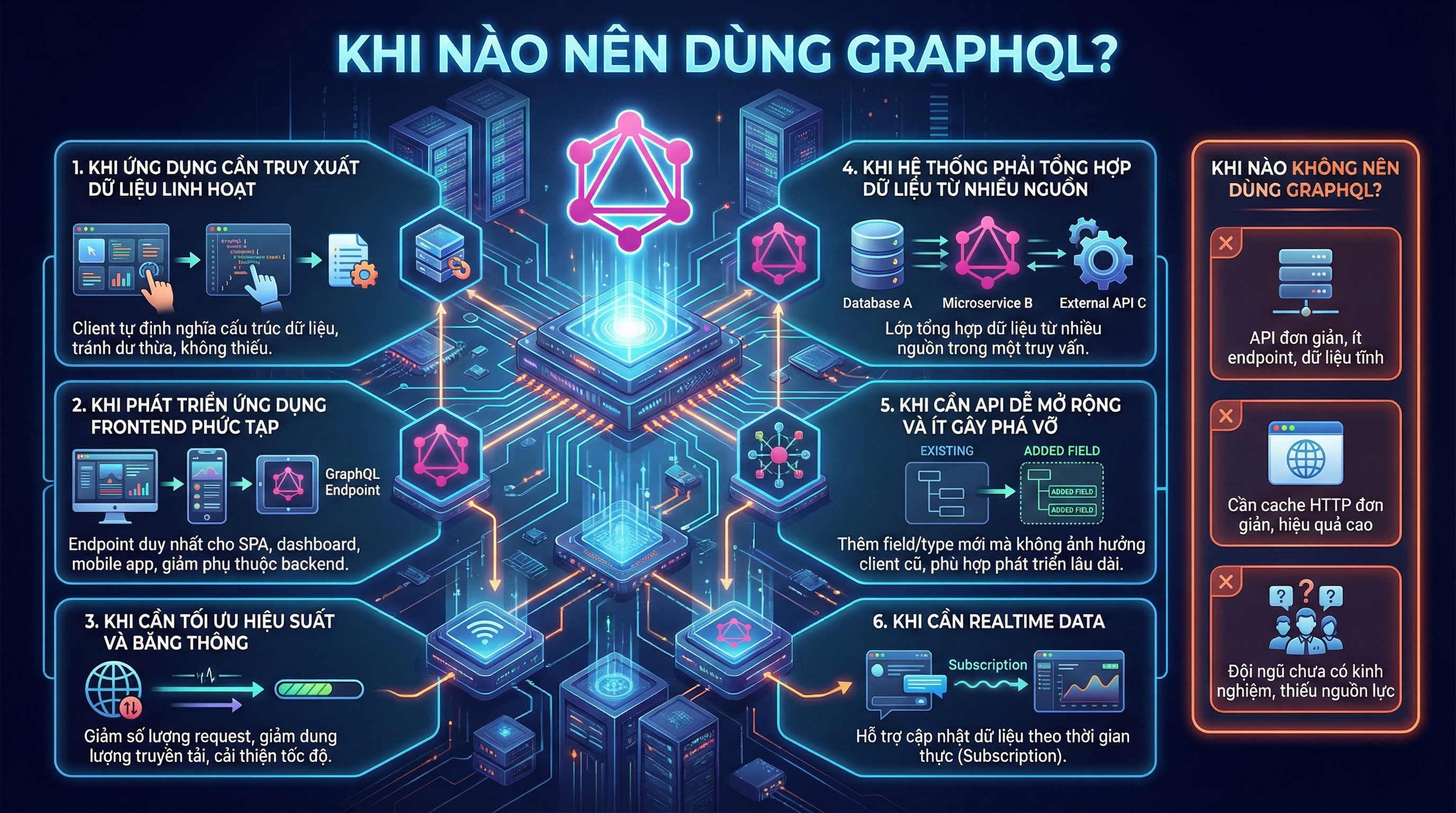 Tuy nhiên, GraphQL không phải là giải pháp phù hợp cho mọi trường hợp. Việc triển khai GraphQL đòi hỏi đội ngũ phát triển cần có kiến thức vững về schema, resolver, chiến lược cache và kiểm soát truy vấn để đảm bảo hiệu suất và tính ổn định của hệ thống. Với các API đơn giản hoặc dự án nhỏ, REST API vẫn có thể là lựa chọn hiệu quả và dễ triển khai hơn.