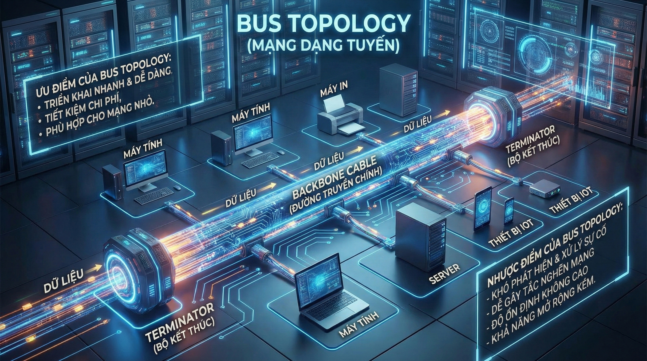 Hai đầu của đường cáp chính được gắn terminator nhằm hấp thụ tín hiệu và ngăn hiện tượng phản xạ dữ liệu, giúp đảm bảo quá trình truyền thông diễn ra ổn định. Trong Bus Topology, mọi thiết bị chia sẻ chung một kênh truyền, vì vậy hoạt động của mạng phụ thuộc rất lớn vào chất lượng và trạng thái của đường cáp trung tâm.