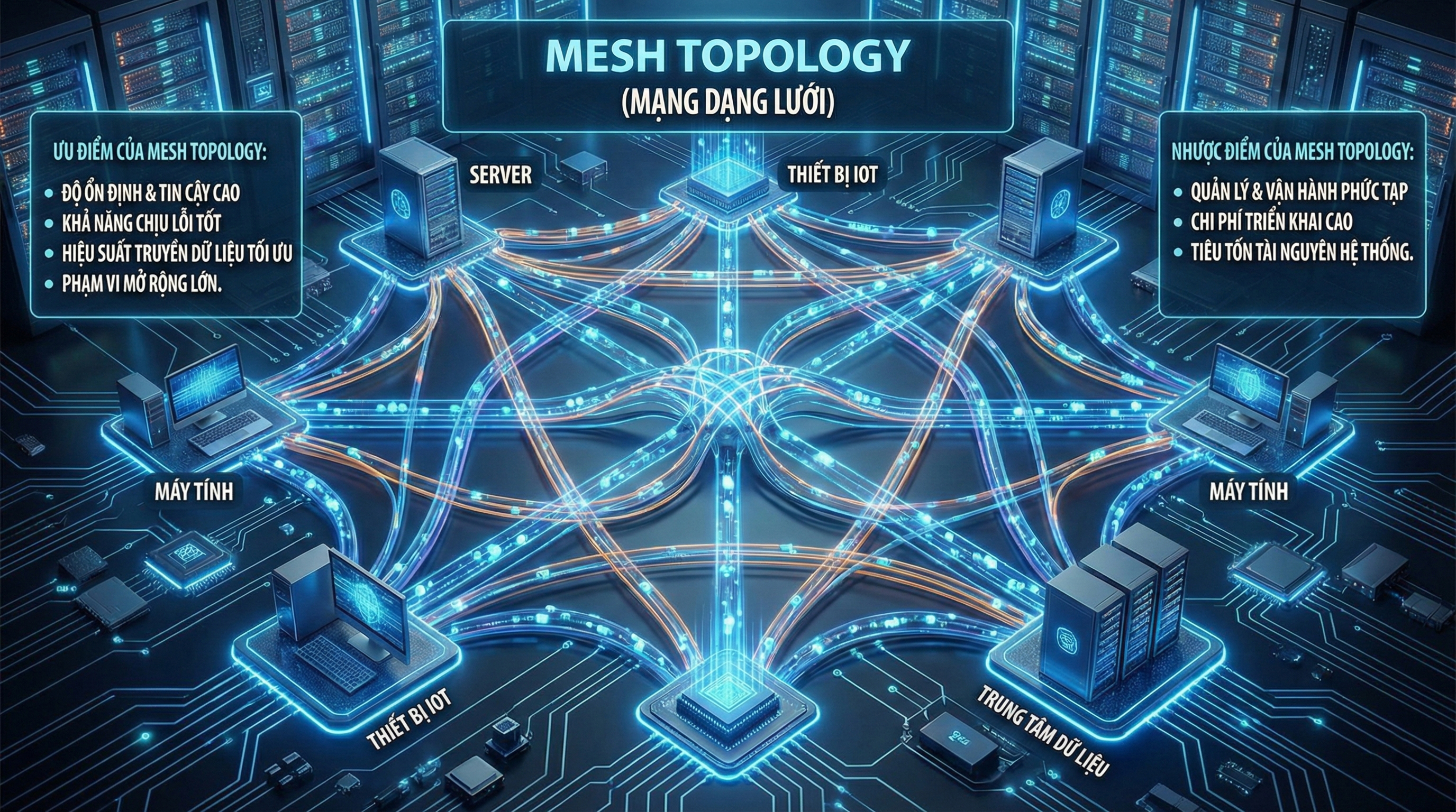 Mesh Topology rất phù hợp cho các hệ thống đòi hỏi tính ổn định và khả năng chịu lỗi cao, nhưng chi phí và độ phức tạp lớn.