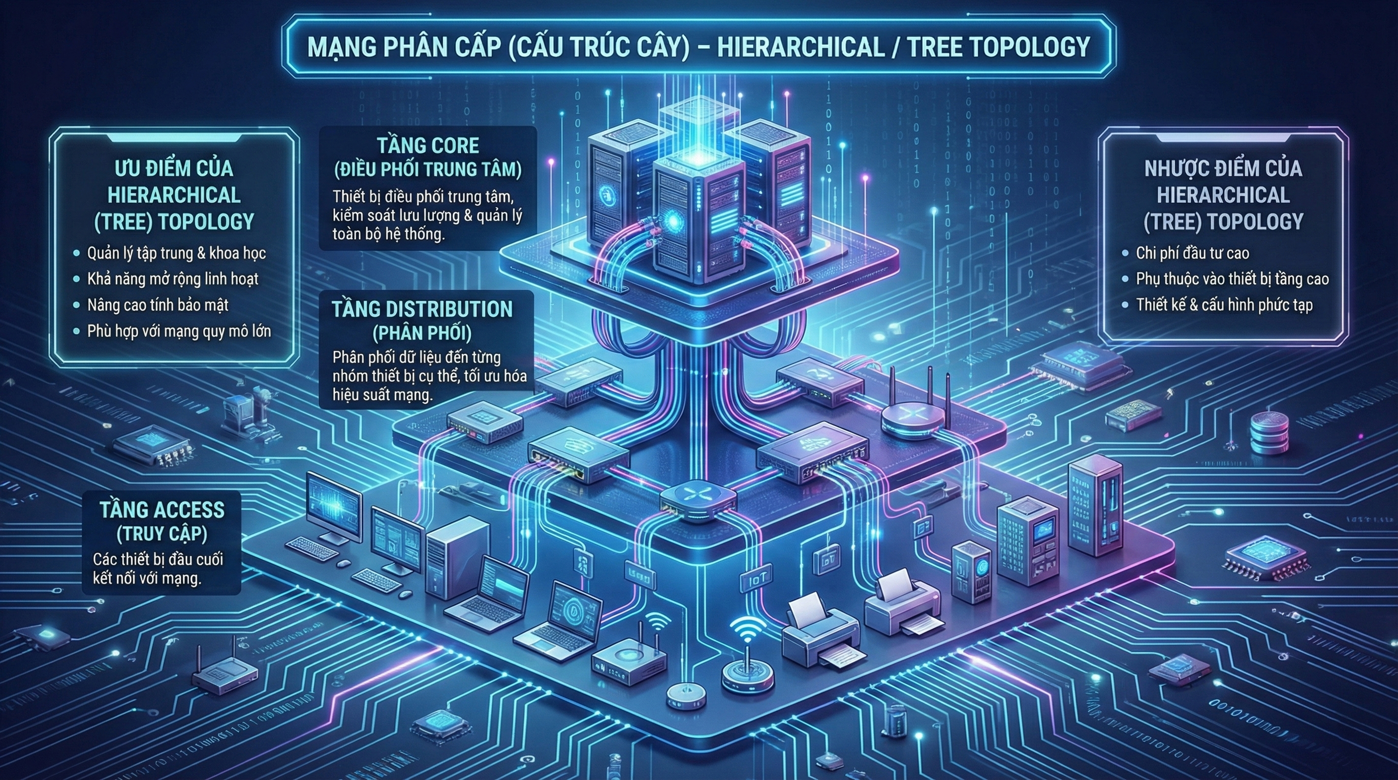 Hierarchical (Tree) Topology là lựa chọn lý tưởng cho hệ thống mạng lớn, cần quản lý tập trung và bảo mật cao, nhưng không phù hợp với mạng nhỏ hoặc môi trường hạn chế ngân sách.
