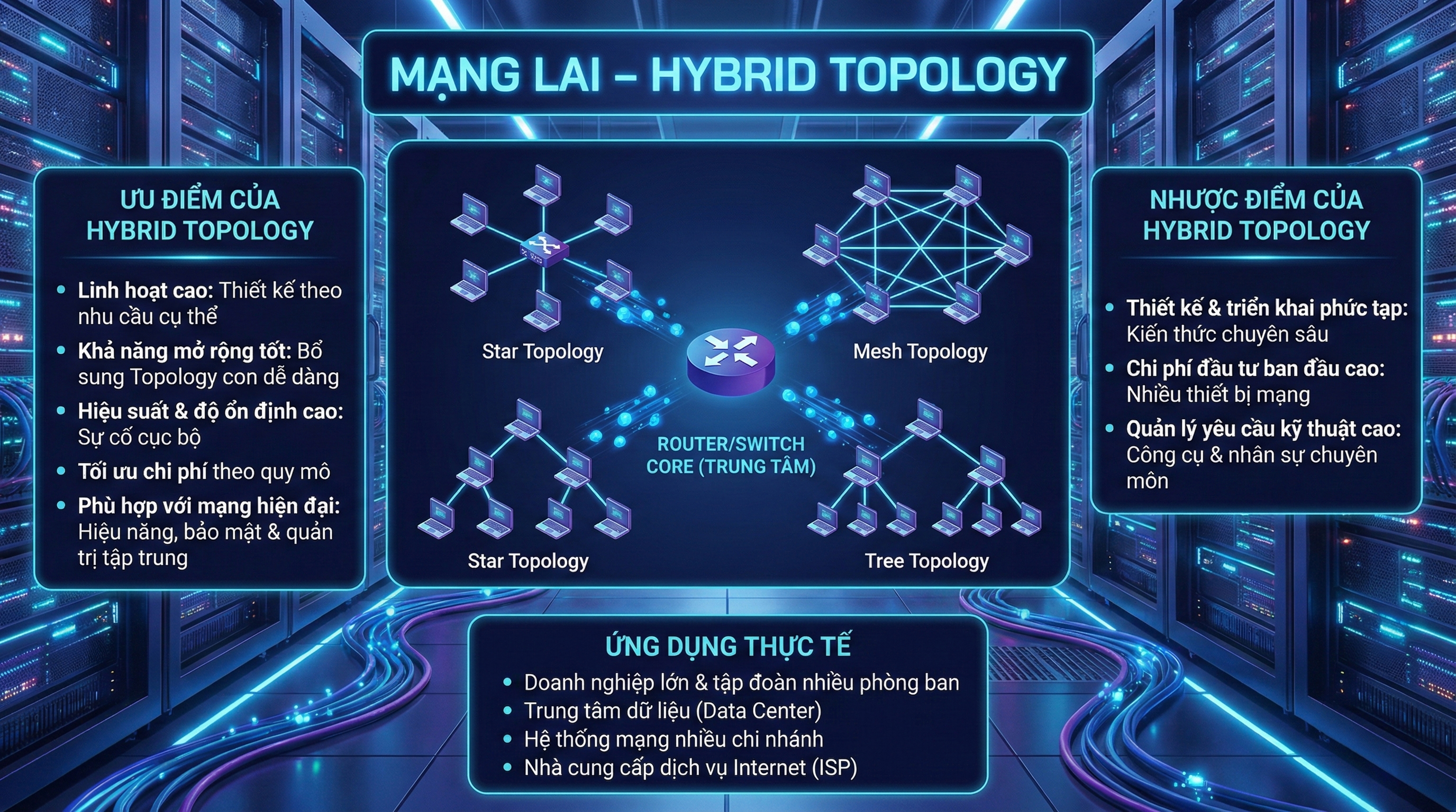 Hybrid Topology hiện là mô hình được sử dụng phổ biến nhất trong thực tế, đặc biệt trong mạng doanh nghiệp, trung tâm dữ liệu, hệ thống nhiều chi nhánh và hạ tầng ISP.