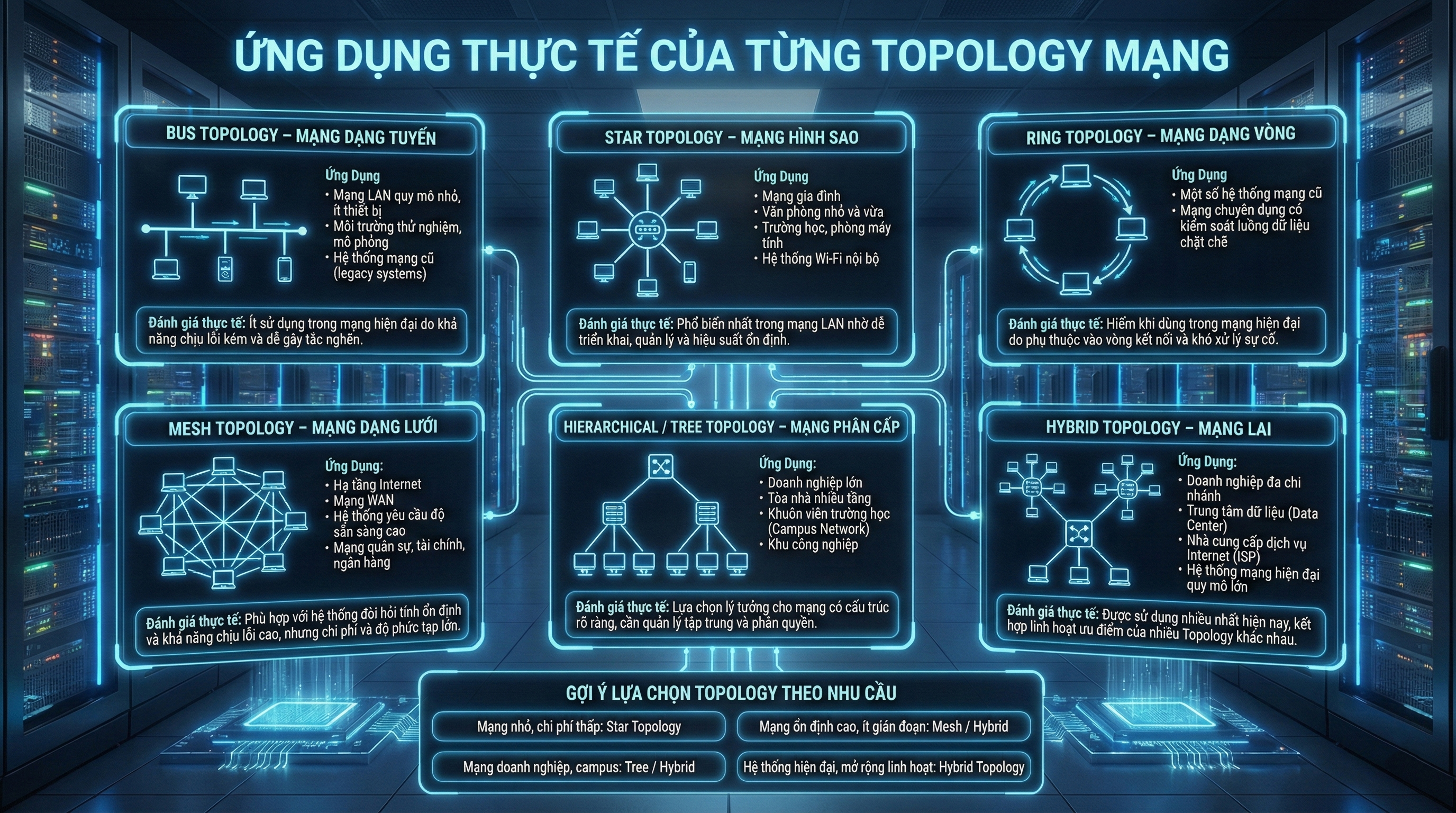 Trong thực tế hiện nay, Star Topology vẫn là lựa chọn phổ biến cho mạng gia đình và văn phòng nhờ tính đơn giản và dễ quản lý. Mesh Topology và Hybrid Topology lại được ưu tiên trong các hệ thống lớn, yêu cầu cao về độ ổn định, khả năng chịu lỗi và tính sẵn sàng. Trong khi đó, Tree Topology giúp doanh nghiệp quản lý mạng hiệu quả theo mô hình phân cấp, còn Bus và Ring Topology chủ yếu mang ý nghĩa lịch sử và tham khảo trong học tập.