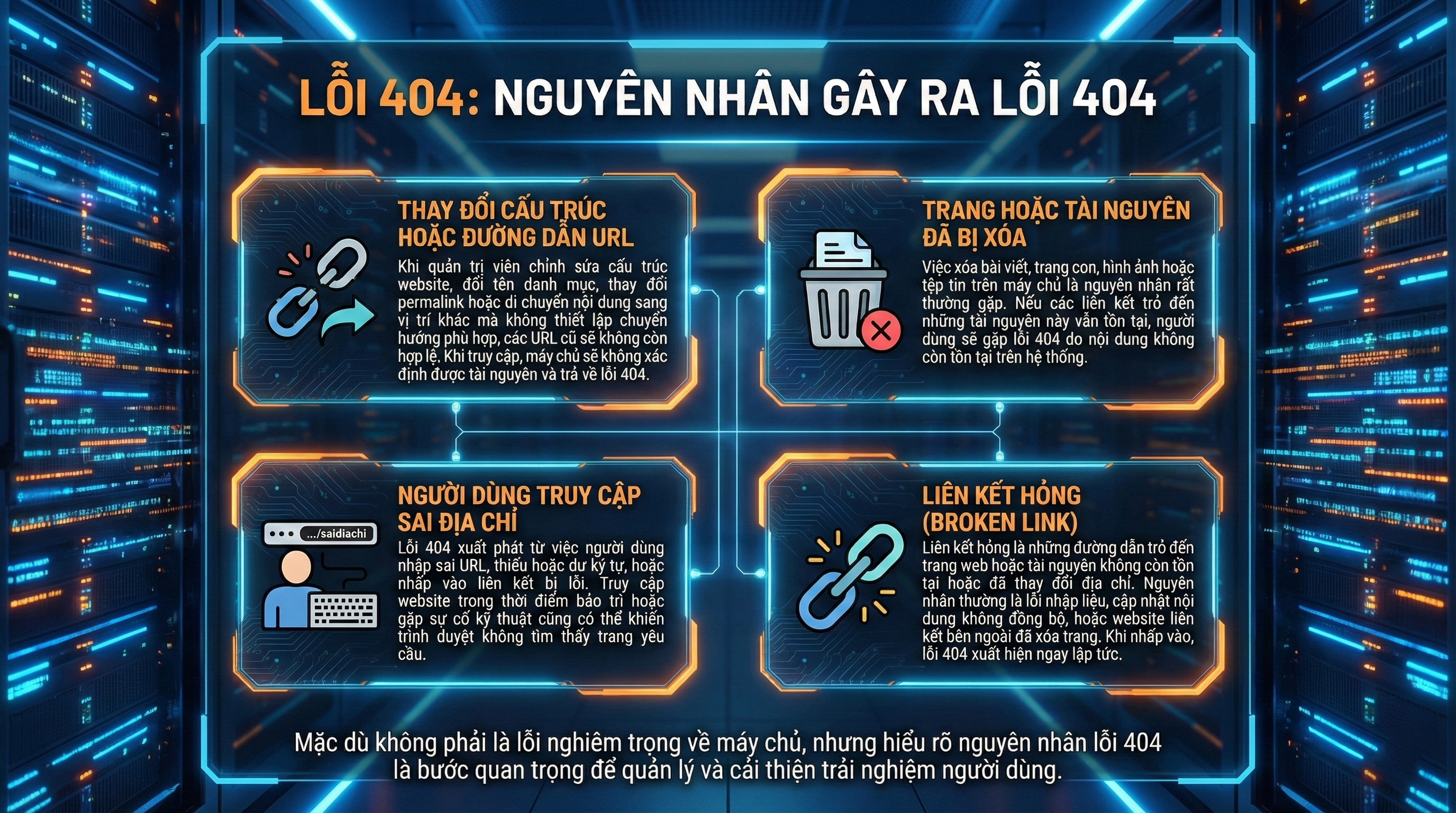 Lỗi 404 có thể xuất hiện ở bất kỳ website nào, từ blog cá nhân đến hệ thống doanh nghiệp lớn. Mặc dù đây không phải lỗi nghiêm trọng về máy chủ, nhưng nó thường bắt nguồn từ nhiều nguyên nhân khác nhau trong quá trình quản lý và sử dụng website. Dưới đây là những nguyên nhân phổ biến nhất dẫn đến lỗi 404.