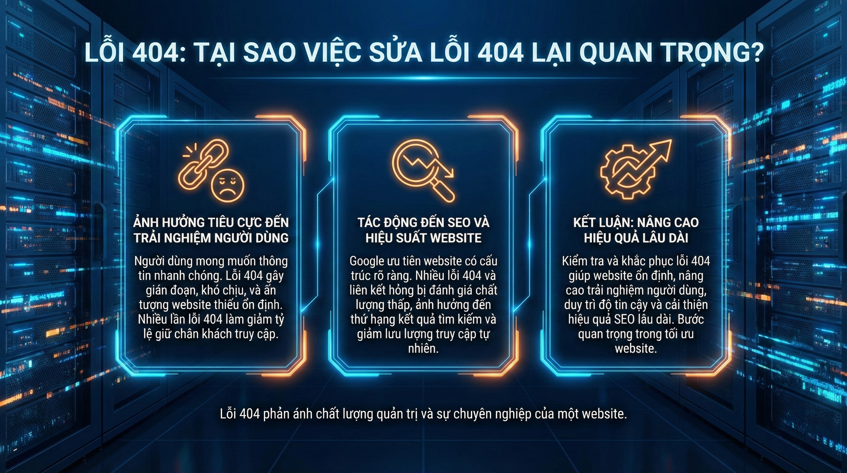 Việc kiểm tra và khắc phục lỗi 404 không chỉ giúp website hoạt động ổn định hơn mà còn góp phần nâng cao trải nghiệm người dùng, duy trì độ tin cậy và cải thiện hiệu quả SEO lâu dài. Chính vì vậy, xử lý lỗi 404 là bước quan trọng không thể bỏ qua trong quá trình vận hành và tối ưu website.