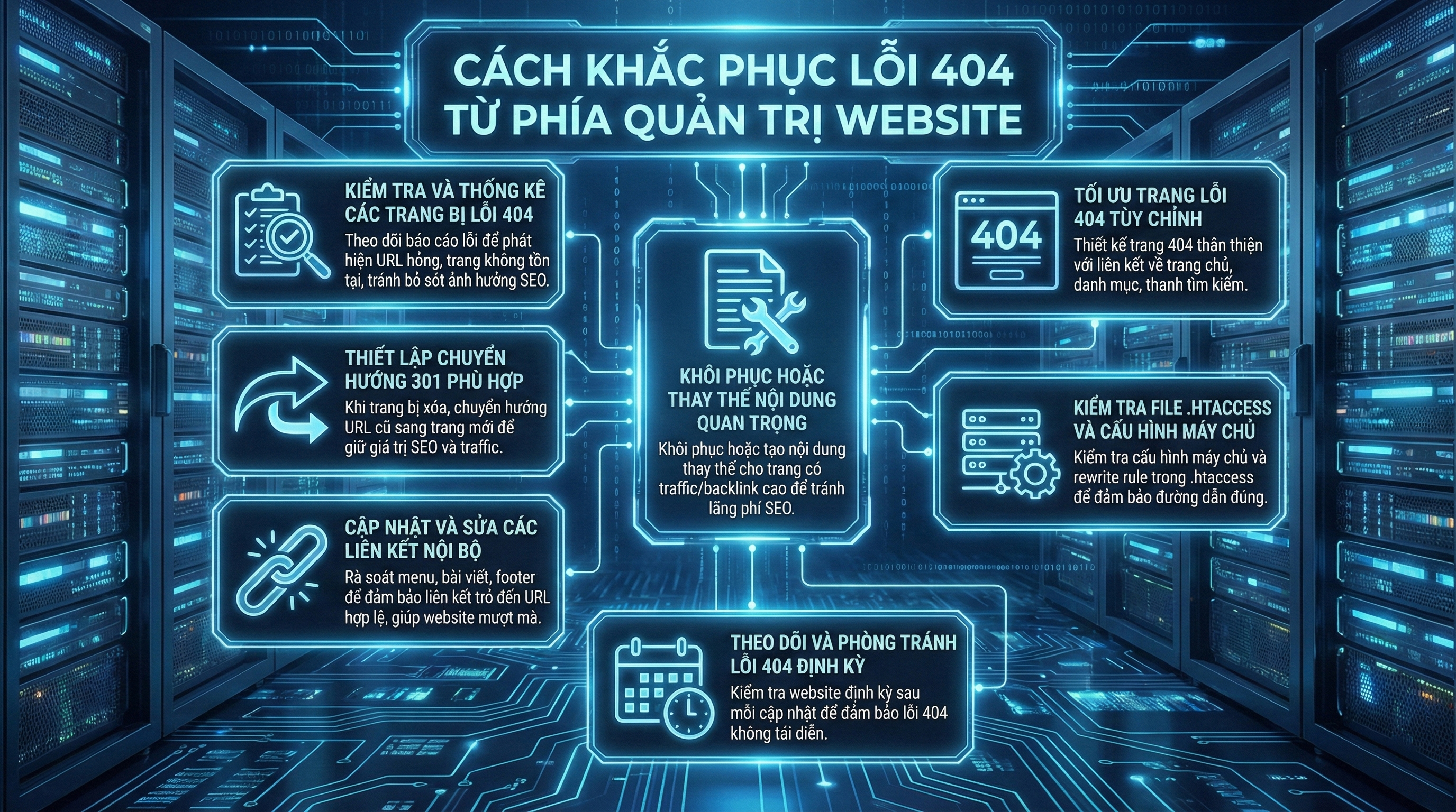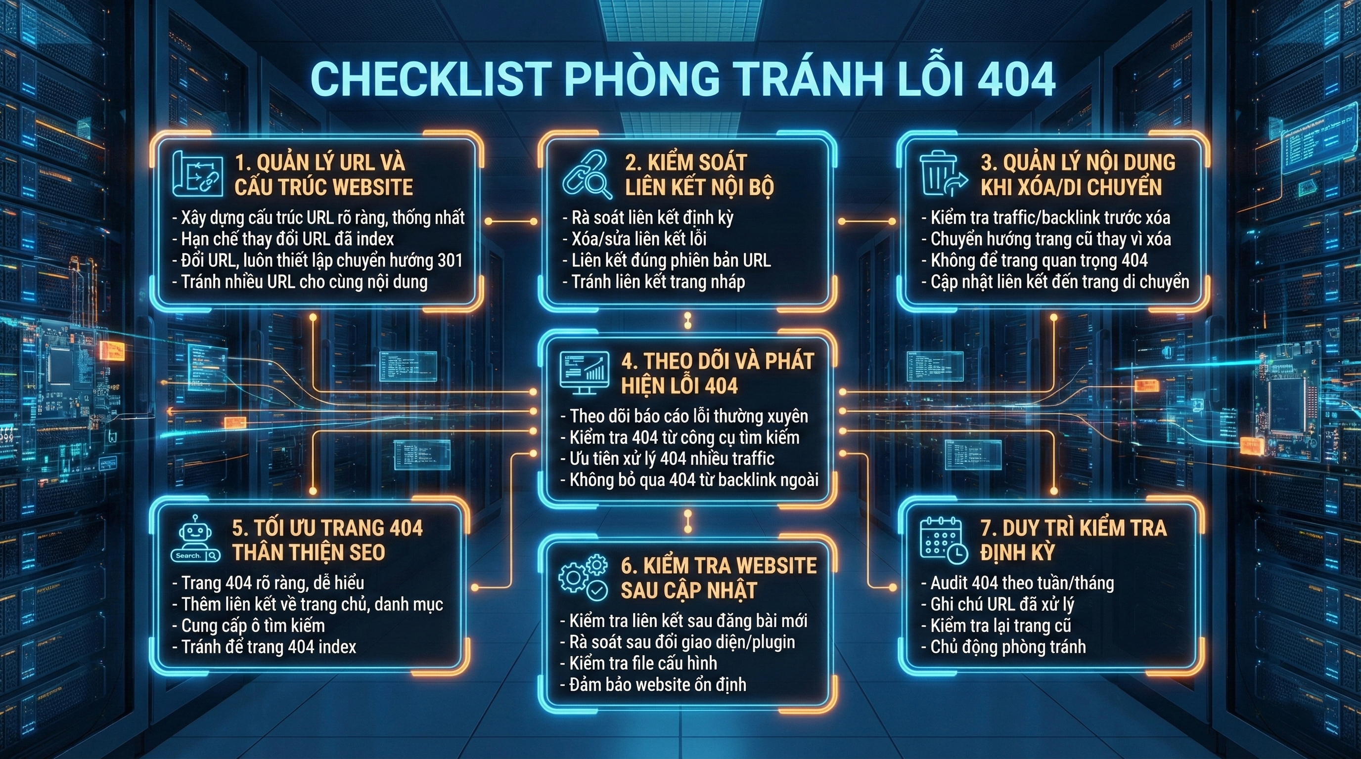 Việc xử lý lỗi 404 không nên thực hiện một lần rồi bỏ qua. Quản trị viên cần kiểm tra website định kỳ, đặc biệt sau khi cập nhật nội dung, thay đổi cấu trúc URL hoặc nâng cấp hệ thống, nhằm đảm bảo lỗi 404 không tái diễn.