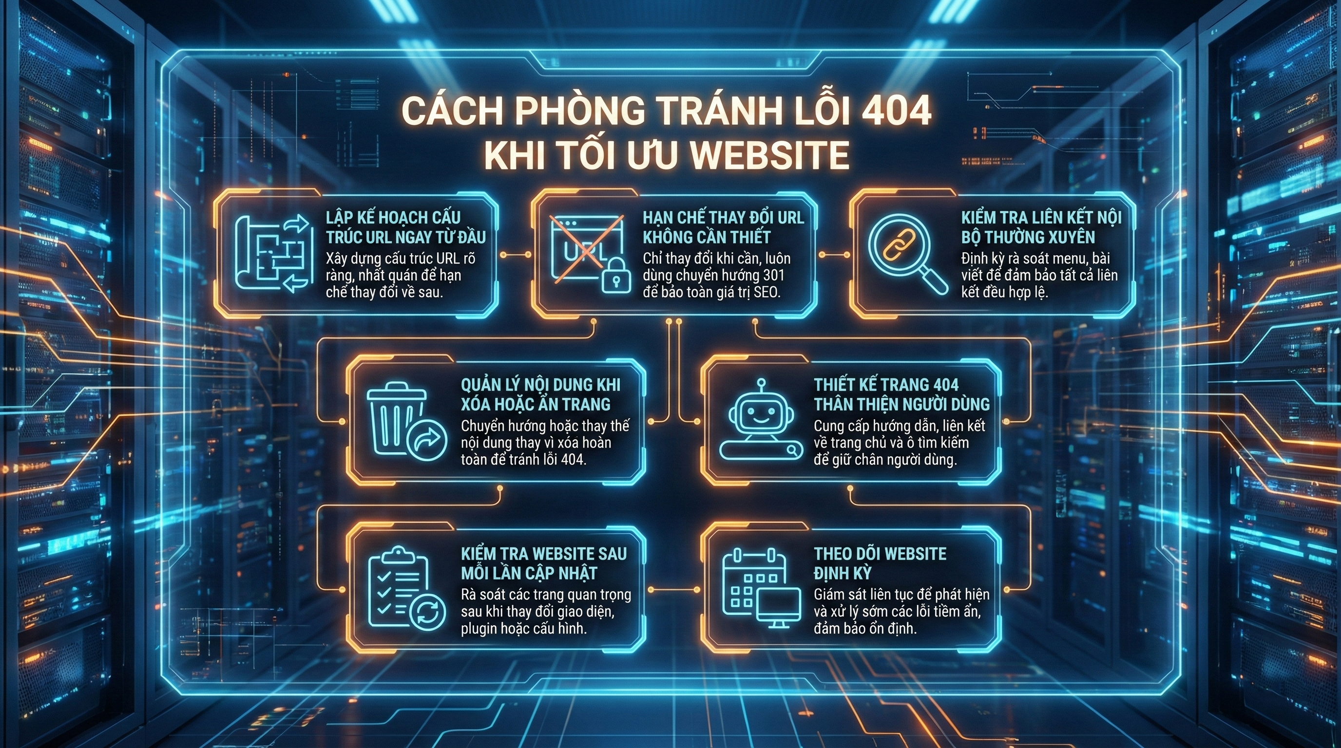 Phòng tránh lỗi 404 là một phần quan trọng trong quá trình tối ưu website lâu dài. Bằng cách quản lý URL chặt chẽ, kiểm soát liên kết, cập nhật nội dung hợp lý và theo dõi website thường xuyên, bạn có thể hạn chế tối đa lỗi 404, từ đó nâng cao trải nghiệm người dùng và hiệu quả SEO một cách bền vững.