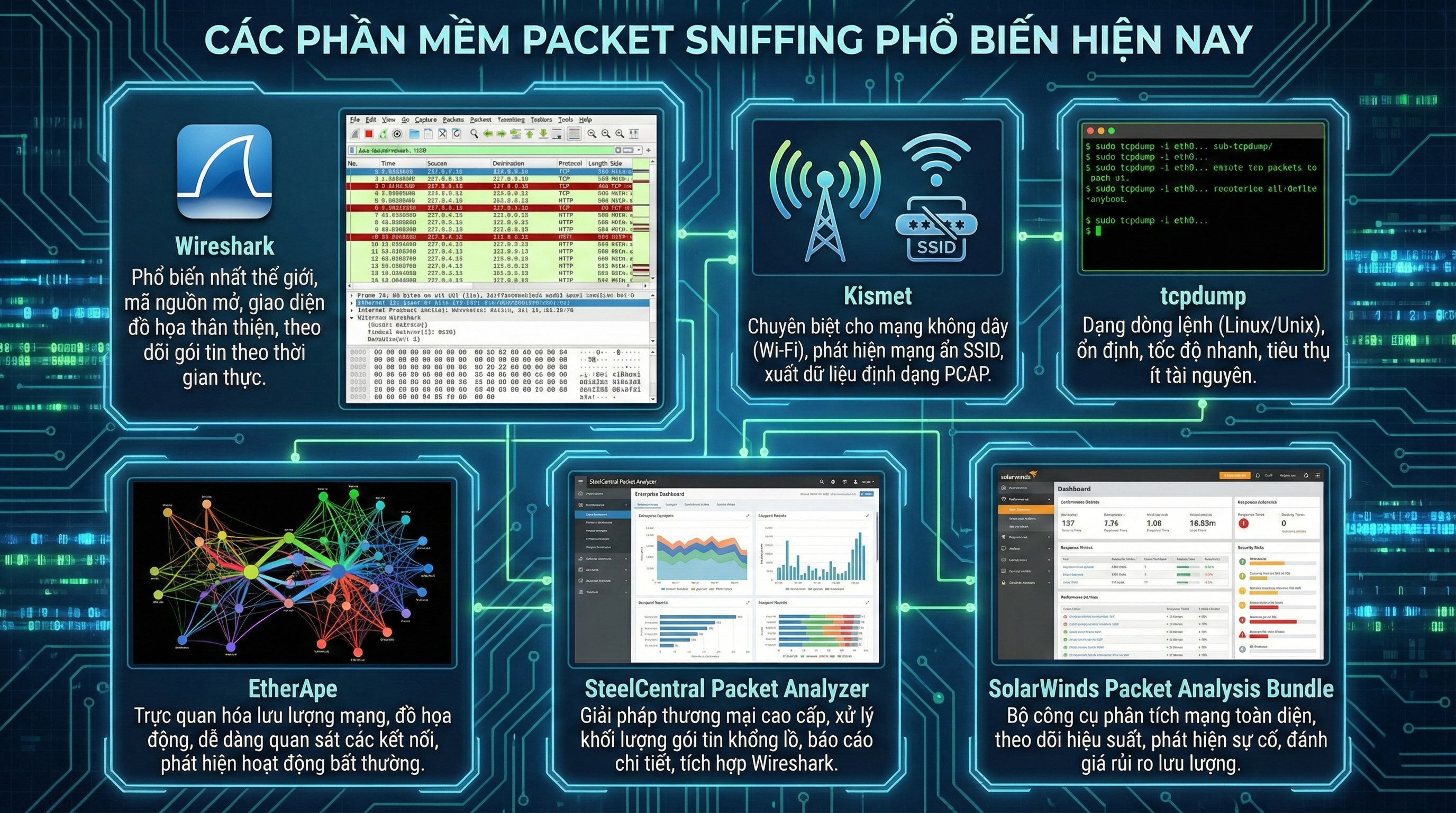 Để hiểu rõ hơn Packet Sniffer là gì và cách công nghệ này được ứng dụng trong thực tế, không thể bỏ qua các phần mềm Packet Sniffing phổ biến đang được sử dụng rộng rãi. Tùy vào mục đích giám sát, chẩn đoán hay bảo mật mạng, người dùng có thể lựa chọn từ công cụ mã nguồn mở miễn phí đến giải pháp thương mại chuyên nghiệp.