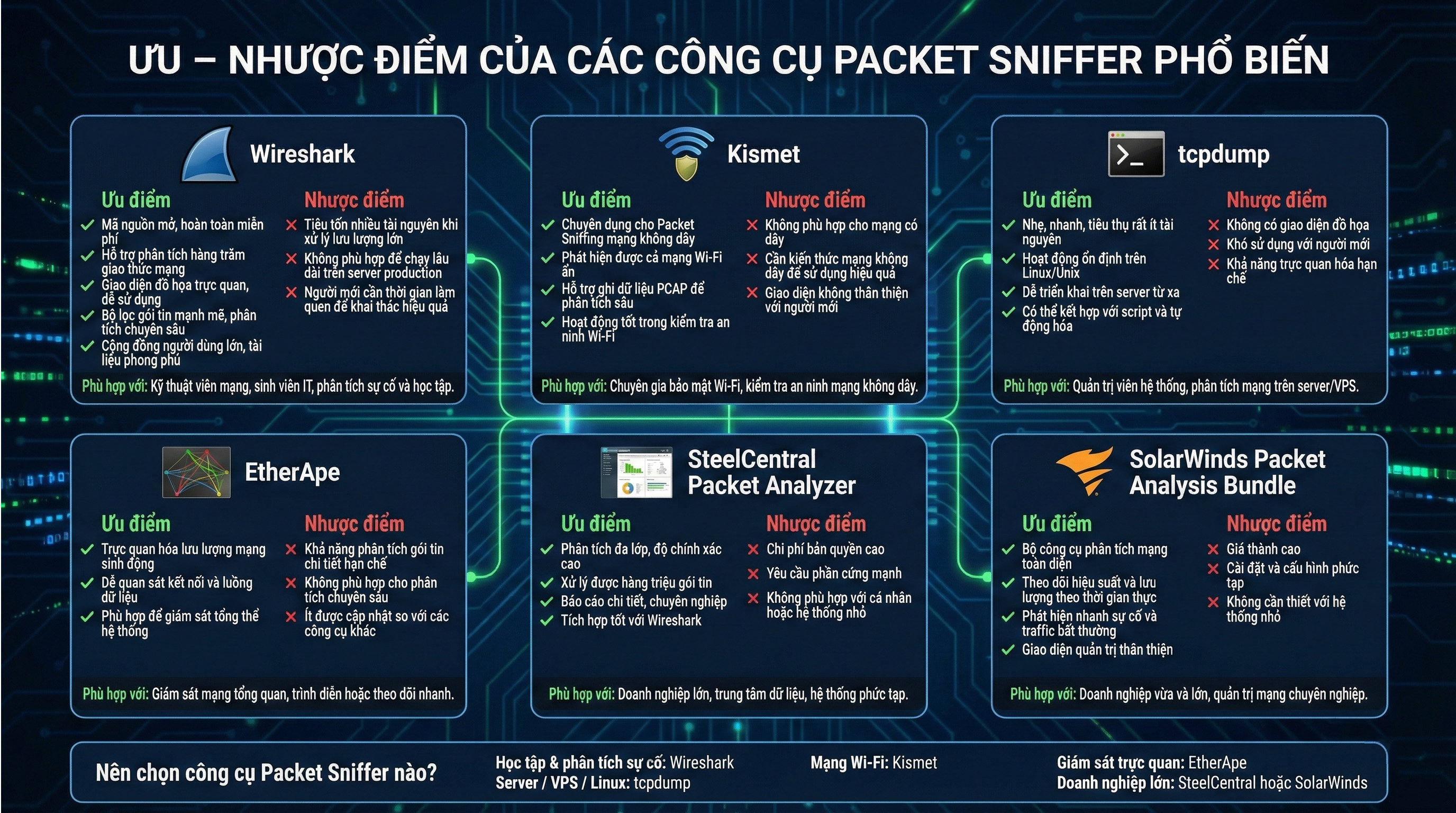 Mỗi công cụ Packet Sniffer đều có thế mạnh và hạn chế riêng, phù hợp với từng mục đích sử dụng khác nhau như phân tích sự cố mạng, giám sát bảo mật hay môi trường doanh nghiệp lớn. Dưới đây là đánh giá chi tiết ưu và nhược điểm của các phần mềm Packet Sniffing phổ biến hiện nay.
