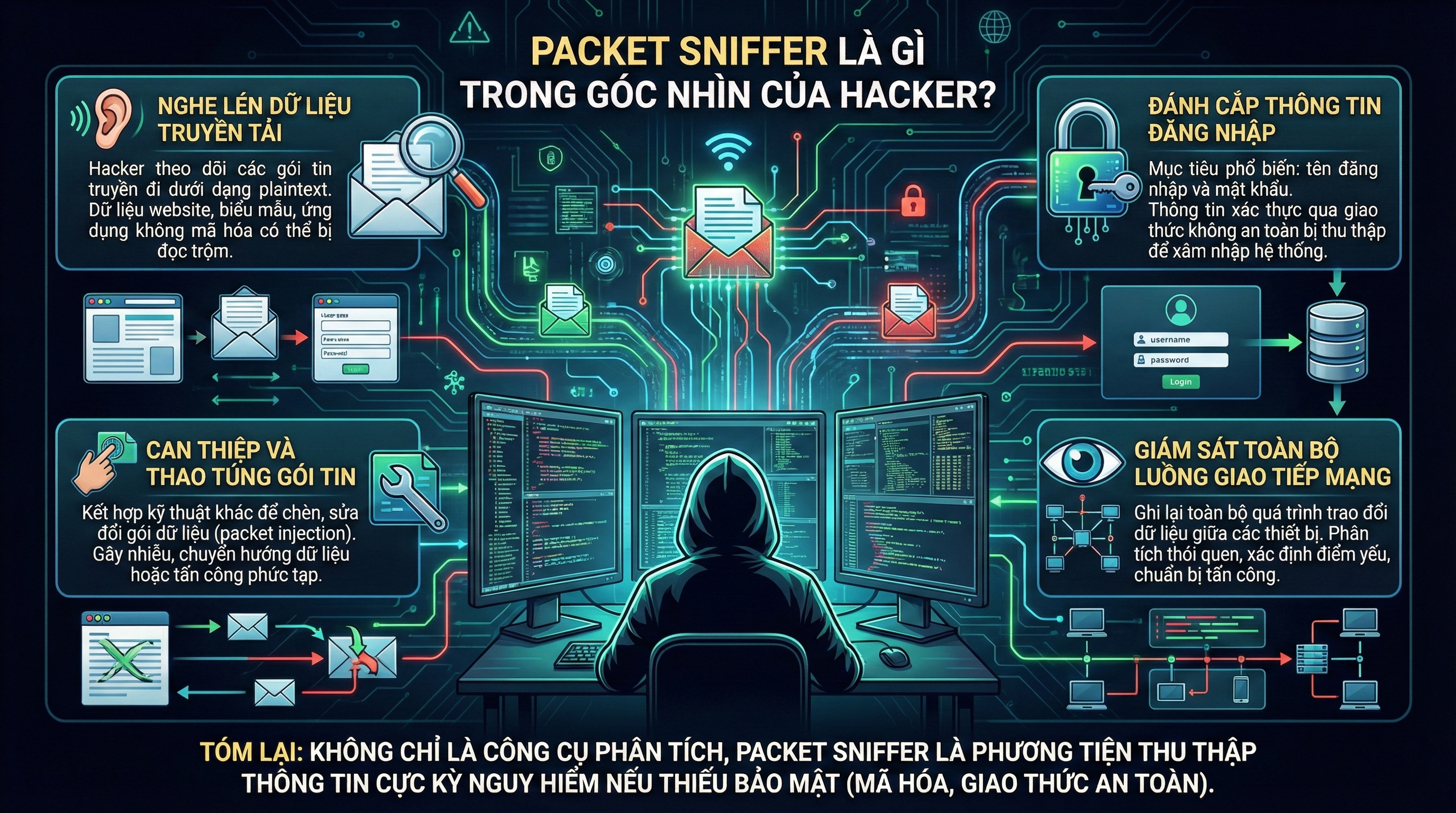 Tóm lại, trong mắt hacker, Packet Sniffer không chỉ là công cụ phân tích mà còn là phương tiện thu thập thông tin cực kỳ nguy hiểm. Nếu thiếu các lớp bảo mật như mã hóa dữ liệu, giao thức an toàn và cấu hình mạng đúng cách, mọi thông tin nhạy cảm được truyền trên mạng đều có nguy cơ bị theo dõi và khai thác.