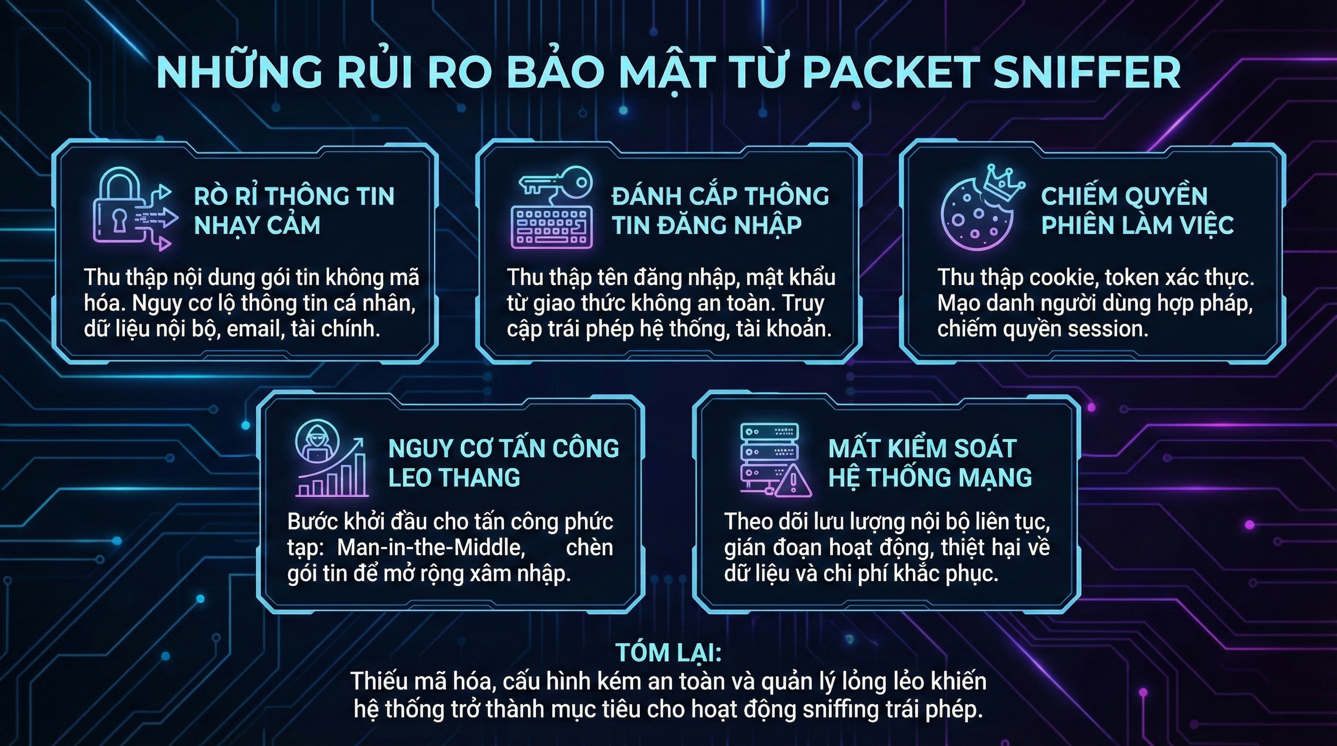 Tóm lại, rủi ro bảo mật từ Packet Sniffer không nằm ở bản thân công cụ, mà ở cách nó bị lợi dụng. Việc thiếu mã hóa, cấu hình mạng kém an toàn và quản lý lỏng lẻo sẽ khiến hệ thống trở thành mục tiêu dễ dàng cho các hoạt động sniffing trái phép. Nhận thức rõ những rủi ro này là bước quan trọng để xây dựng chiến lược bảo mật mạng hiệu quả và bền vững.