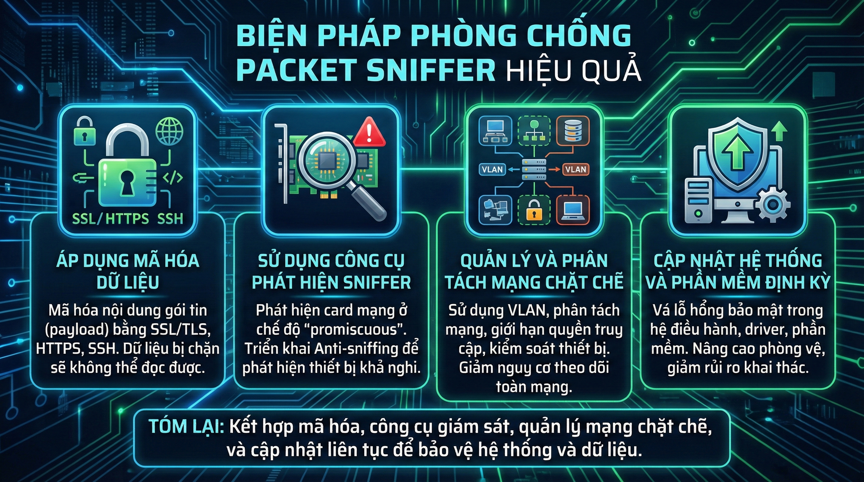 Tóm lại, để phòng chống Packet Sniffer hiệu quả, cần kết hợp mã hóa dữ liệu, công cụ giám sát, quản lý mạng chặt chẽ và cập nhật hệ thống liên tục. Đây là những bước quan trọng giúp bảo vệ thông tin, duy trì sự an toàn và ổn định cho hệ thống mạng trong môi trường số ngày càng phức tạp.
