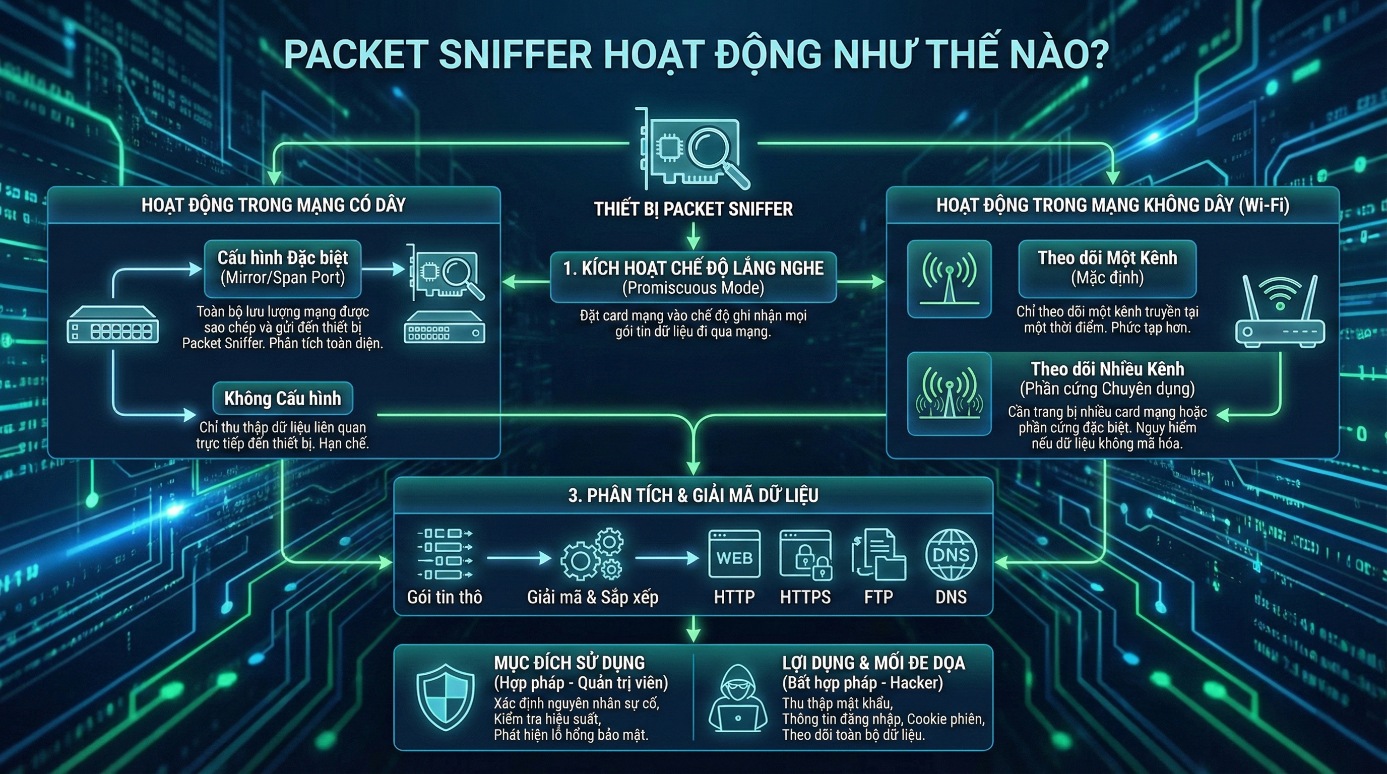 Khi được kích hoạt, Packet Sniffer sẽ đặt card mạng của thiết bị vào chế độ lắng nghe, cho phép nó ghi nhận các gói tin dữ liệu đi qua mạng, thay vì chỉ tiếp nhận những gói tin gửi trực tiếp đến thiết bị như thông thường.