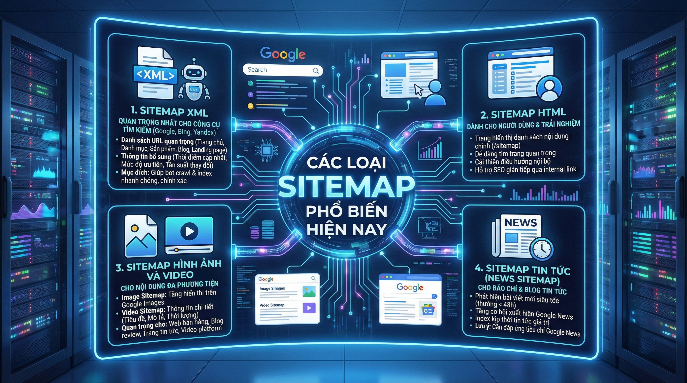 Sau khi nắm được khái niệm Sitemap là gì, bước tiếp theo bạn cần hiểu là Sitemap không chỉ có một loại duy nhất. Tùy vào đặc thù website và loại nội dung, Sitemap được chia thành nhiều dạng khác nhau, mỗi loại phục vụ một mục đích riêng trong quá trình SEO và lập chỉ mục.