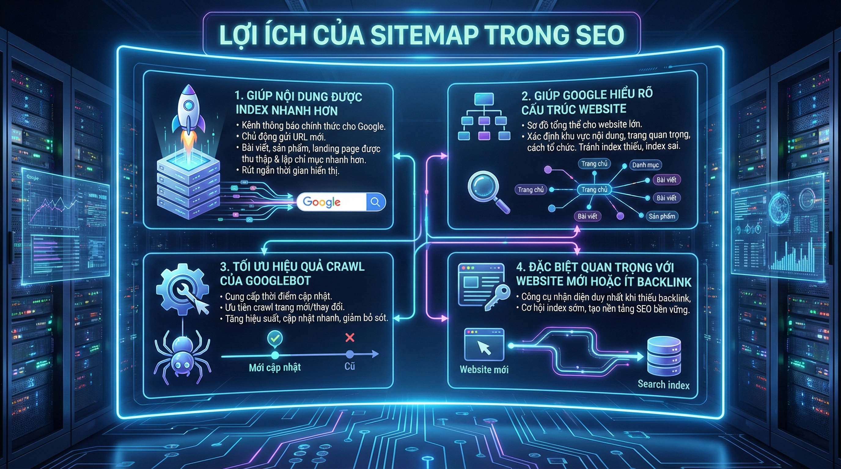 Sitemap tuy chỉ là một tệp XML đơn giản nhưng lại đóng vai trò vô cùng quan trọng trong toàn bộ quá trình SEO website. Thông qua Sitemap, Google có thể nhanh chóng hiểu được cấu trúc trang web, phát hiện nội dung mới, ưu tiên thu thập dữ liệu đúng trang và hạn chế tối đa tình trạng bỏ sót các URL quan trọng.