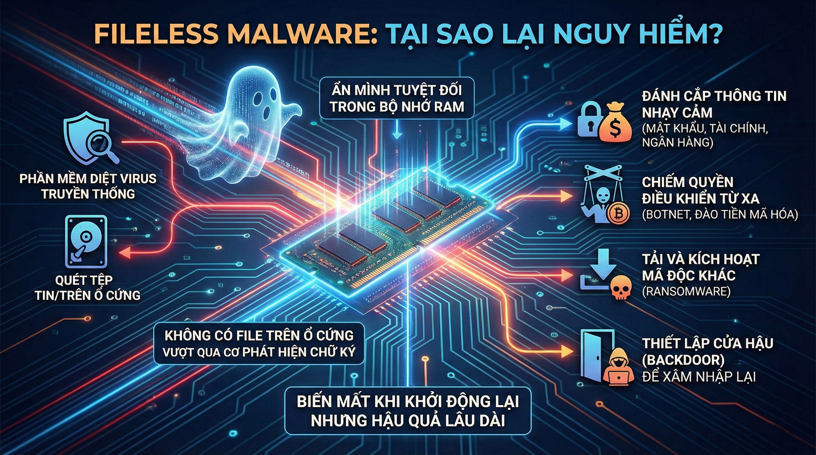 Điểm nguy hiểm của Fileless Malware nằm ở khả năng ẩn mình sâu trong hệ thống, chỉ tồn tại trong bộ nhớ khi máy đang hoạt động và tự xóa dấu vết khi khởi động lại. Điều này không chỉ gây khó khăn cho việc phát hiện mà còn khiến quá trình điều tra, truy vết và khắc phục sự cố trở nên phức tạp hơn rất nhiều.
